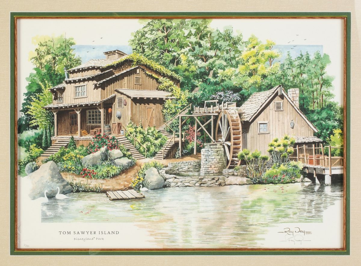 (Disneyland, 2001) Custom framed print of "Tom Sawyer Island" by artist Ray Day, created for the official Disneyana Convention in 2001. This piece is signed by the artist in the lower right corner, and is numbered 21/150. Measures 25"x31". In very good condition.