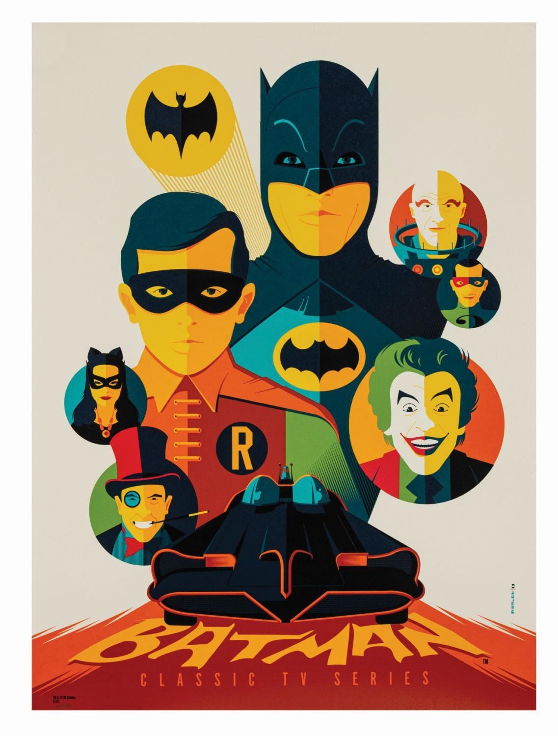 (Huckleberry, 2013) A limited edition silkscreen print featuring the stars of the 1960s Batman TV series by artist Tom Whalen created as a San Diego Comic-Con exclusive for the Huckleberry Toys booth. The print is hand-numbered in pencil at bottom left, "101/350". Measuring 24"x18, the print is in fine condition with minimal wear.