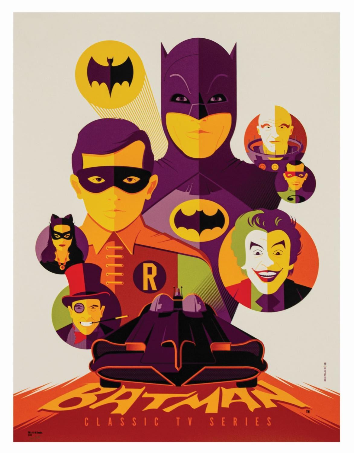 (Huckleberry, 2013) A limited edition "Purple Variant" silkscreen print featuring the stars of the 1960s Batman TV series by artist Tom Whalen created as a San Diego Comic-Con exclusive for the Huckleberry Toys booth. The print is hand-numbered in pencil at bottom left, "145/175". Measuring 24"x18, the print is in fine condition with minimal wear.