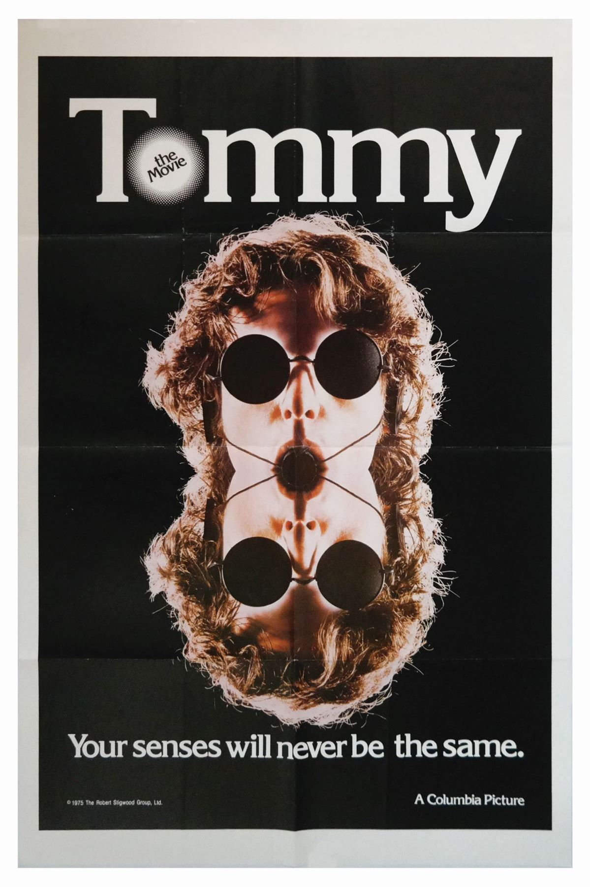 (Columbia, 1975) An advance one sheet poster for the fantasy operetta Tommy. Based on The Who's album of the same name, the film featured an incredible cast including Roger Daltrey, Oliver Reed, Eric Clapton, Elton John, Tina Turner, Ann-Margret, and Jack Nicholson. The poster measures 41"x27" and is in good condition overall with some surface wear along the original fold lines. There are minor spots of discoloration to the reverse.