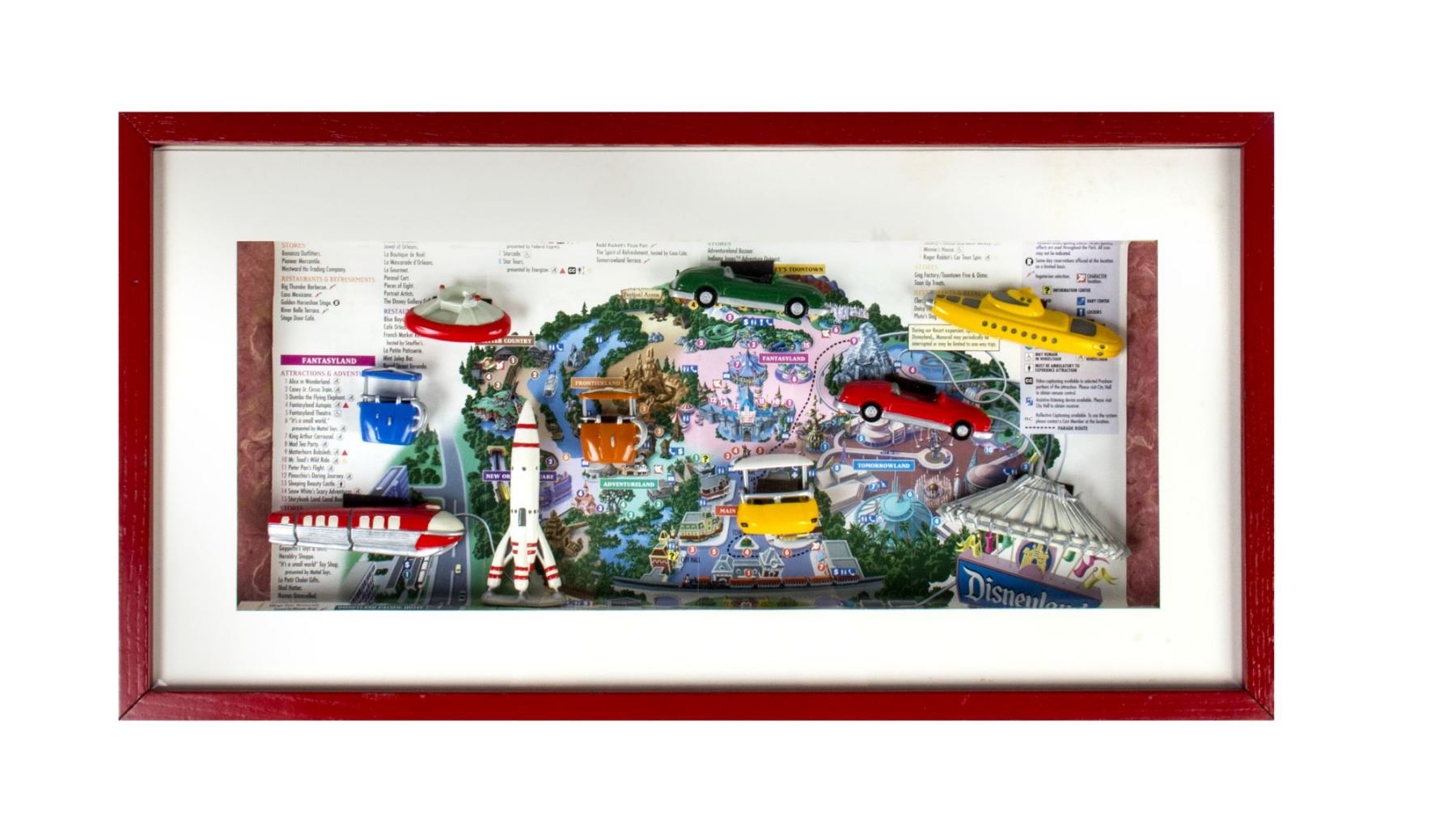 (Disneyland, 1998) A very scarce set of (10) attraction vehicle ceramic magnets that have been custom framed in a beautiful display. The back of the frame has a hand-written note from the original owner that mentions the ceramic figures were purchased at Disneyland's "Star Trader" souvenir shop in Tomorrowland in 1998, and the figures were likely created in celebration of the New Tomorrowland refurbishment of that year. The display houses the figures over a souvenir park map which presents the vehicle figures perfectly. Included in this set are vehicles from: "Flying Saucers", "Skyway", "Monorail", "Rocket to the Moon", "PeopleMover", Autopia", "Submarine Voyage", and the "Space Mountain" building. The framed display measures 11"x21" and 1.5" thick and is in good condition with some wear to the frame from previous display.