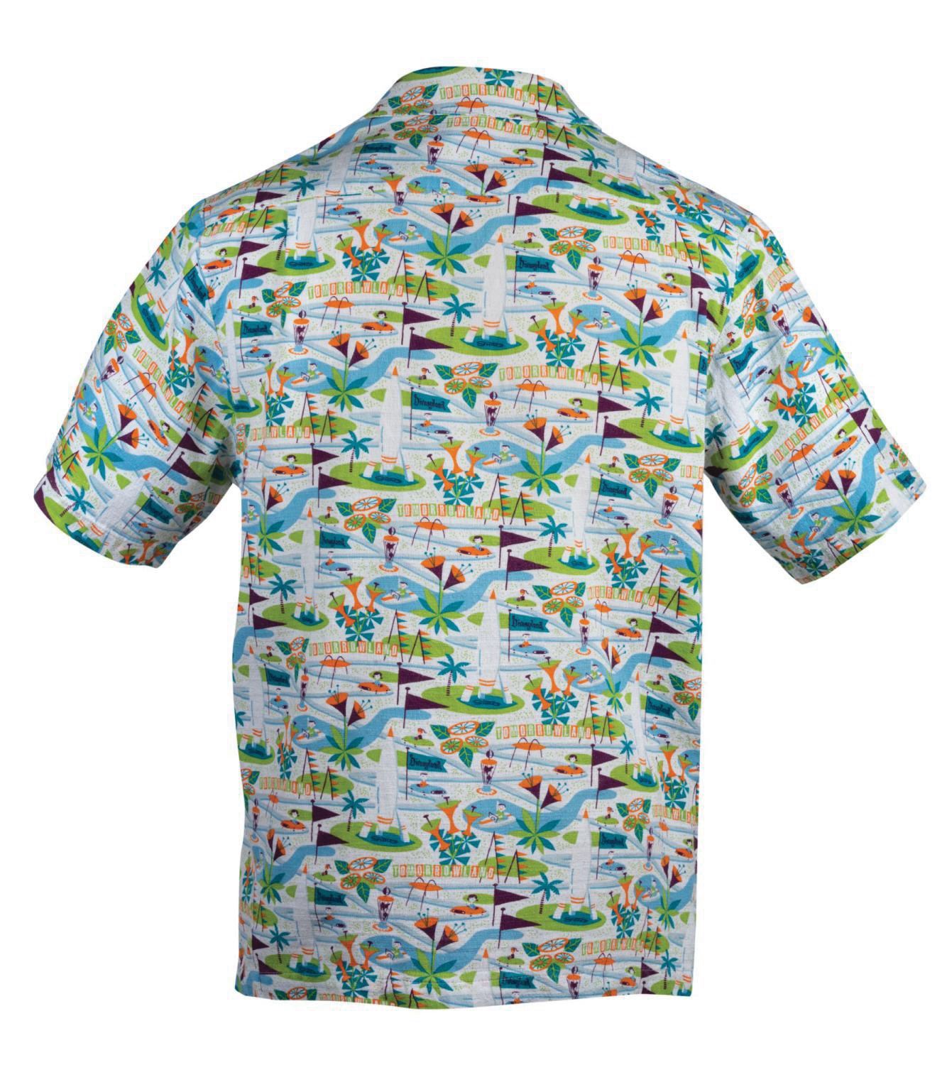 (Disneyland, 2005) A limited edition Tomorrowland aloha shirt by Shag. Autopia drivers and Motorboat pilots speed through the highways, byways, and waterways of Tomorrowland on this limited edition shirt produced by Shag, for the 50th anniversary of Disneyland in 2005. Measuring a size large, the quality cotton shirt with wood buttons was produced to an edition of 500, and is in very good condition with minor wear. One eyelet has unthreaded, making it difficult to fasten that button.