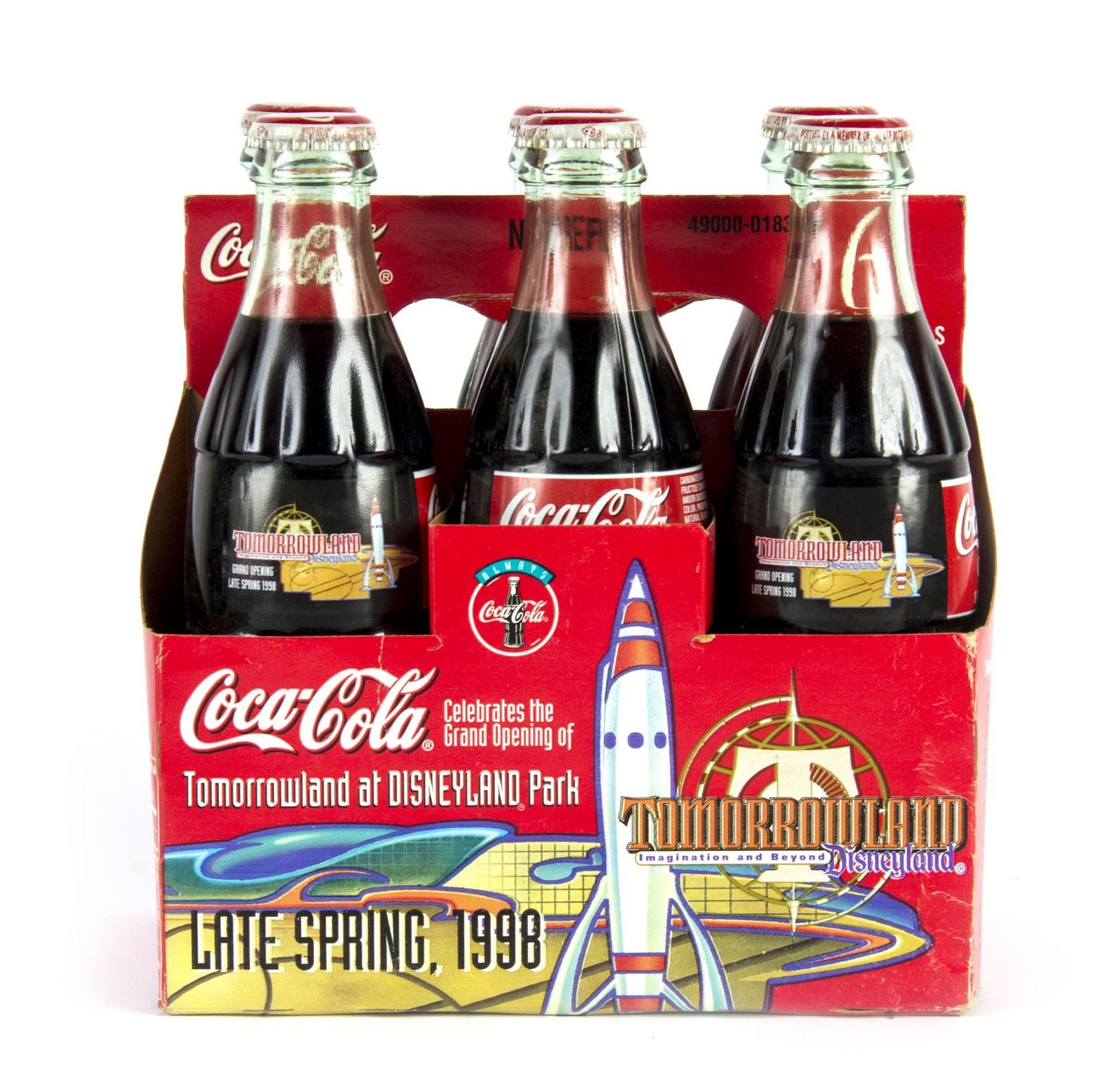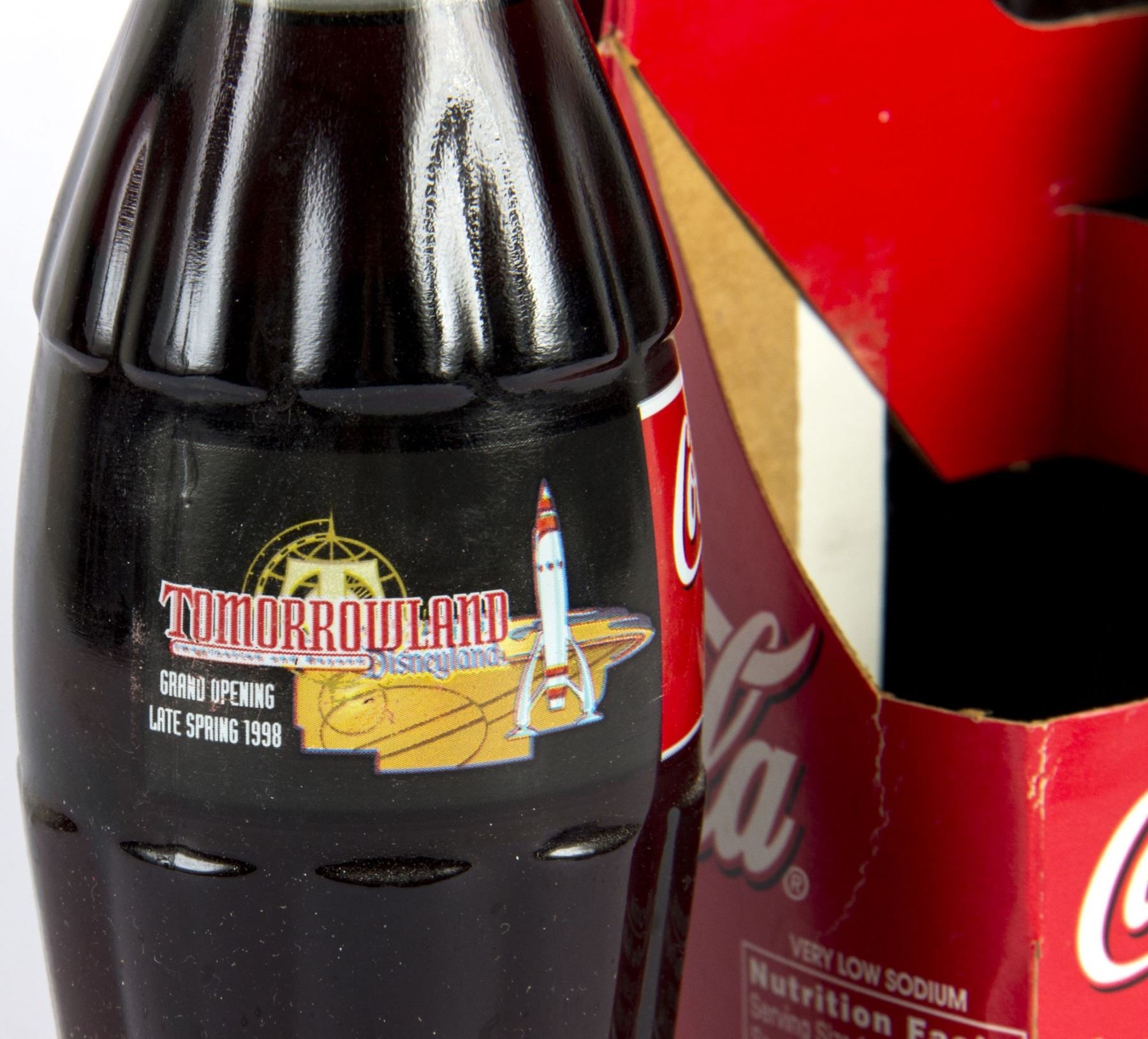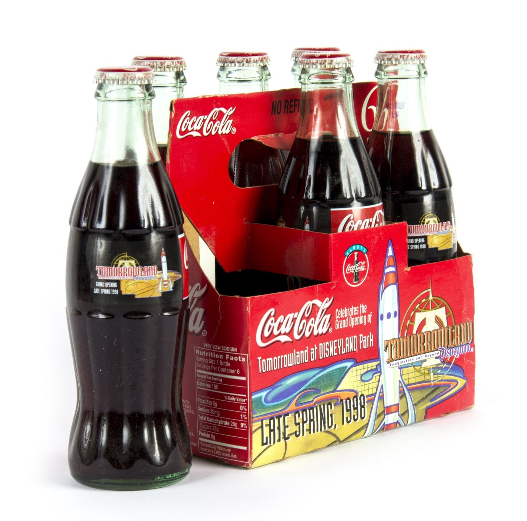 (Disneyland, 1998) A box of six Tomorrowland Coca-Cola bottles created to promote the "New Tomorrowland" refurbishments. This item measures 7"x4.5" and 8" tall in its original box and is in very good condition.