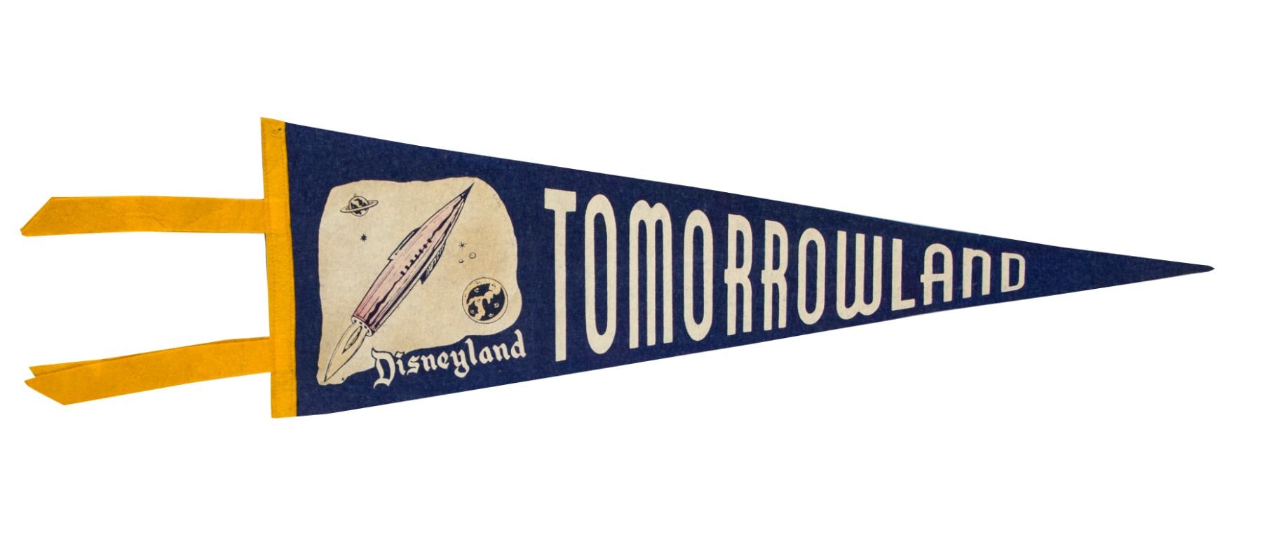 (Disneyland, c.1955) A very rare and unusual pennant from the earliest days of the park. This Tomorrowland pennant features imagery modeled after some of the early conceptual artwork for the land. The pennant measures 8.5"x26", not including the tassels, and is in very good condition with minor wear.