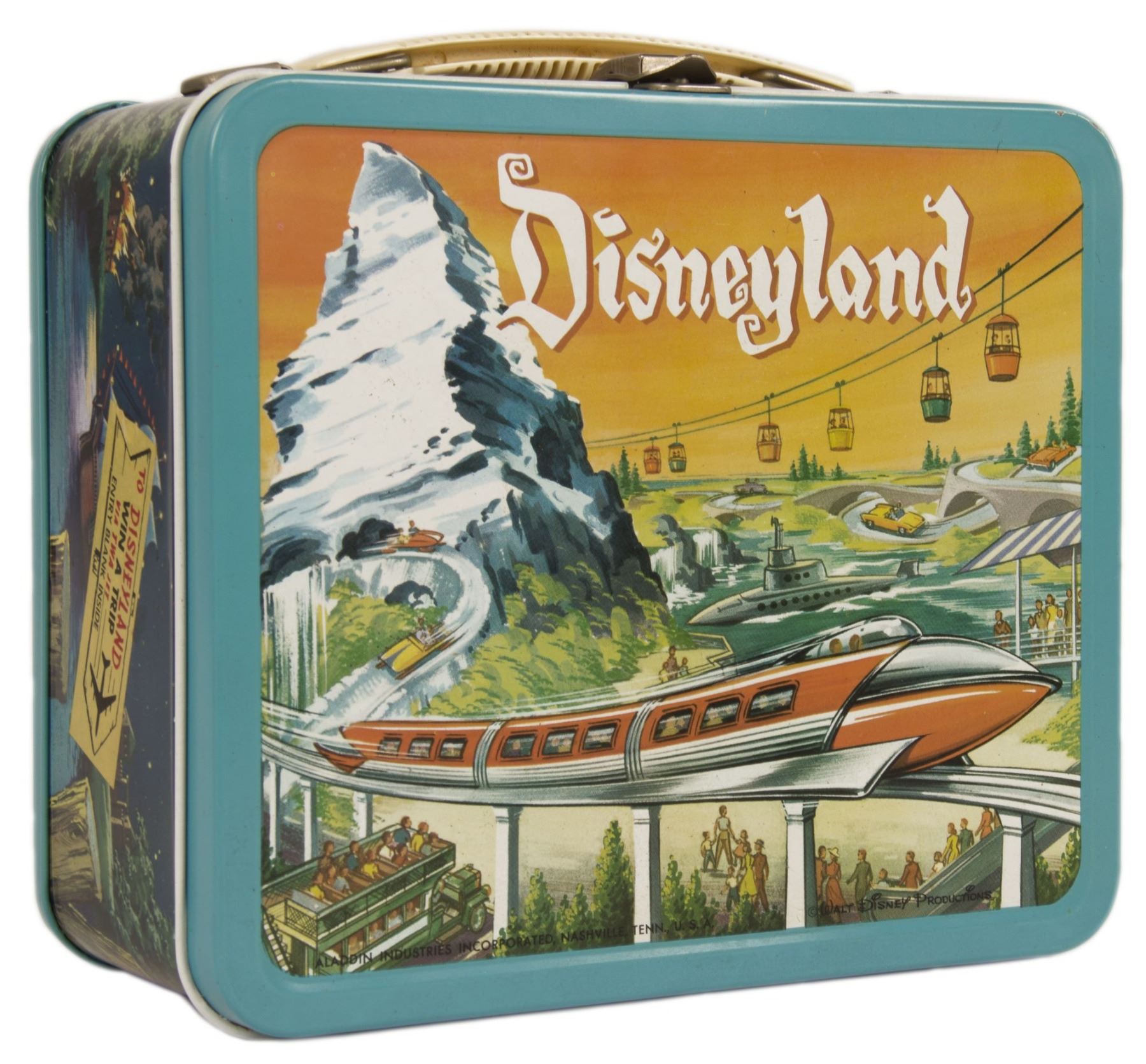 (Disneyland, 1960) A very rare metal lunchbox created by Aladdin Industries that features beautiful imagery based on the attractions and lands of Disneyland. Large colorful images of the Monorail, Submarine Voyage, and Frontierland decorate the sides of this difficult to find lunchbox, which includes its original metal thermos. The lunchbox has a few rare details, such as a TWA Disneyland contest sticker on one side, and an original Aladdin product sticker on the other side. Measuring 6.75"x8" and 4" thick, the lunchbox itself is in very fine condition with minor surface and interior wear. The thermos has moderate wear from use but still presents very nicely.