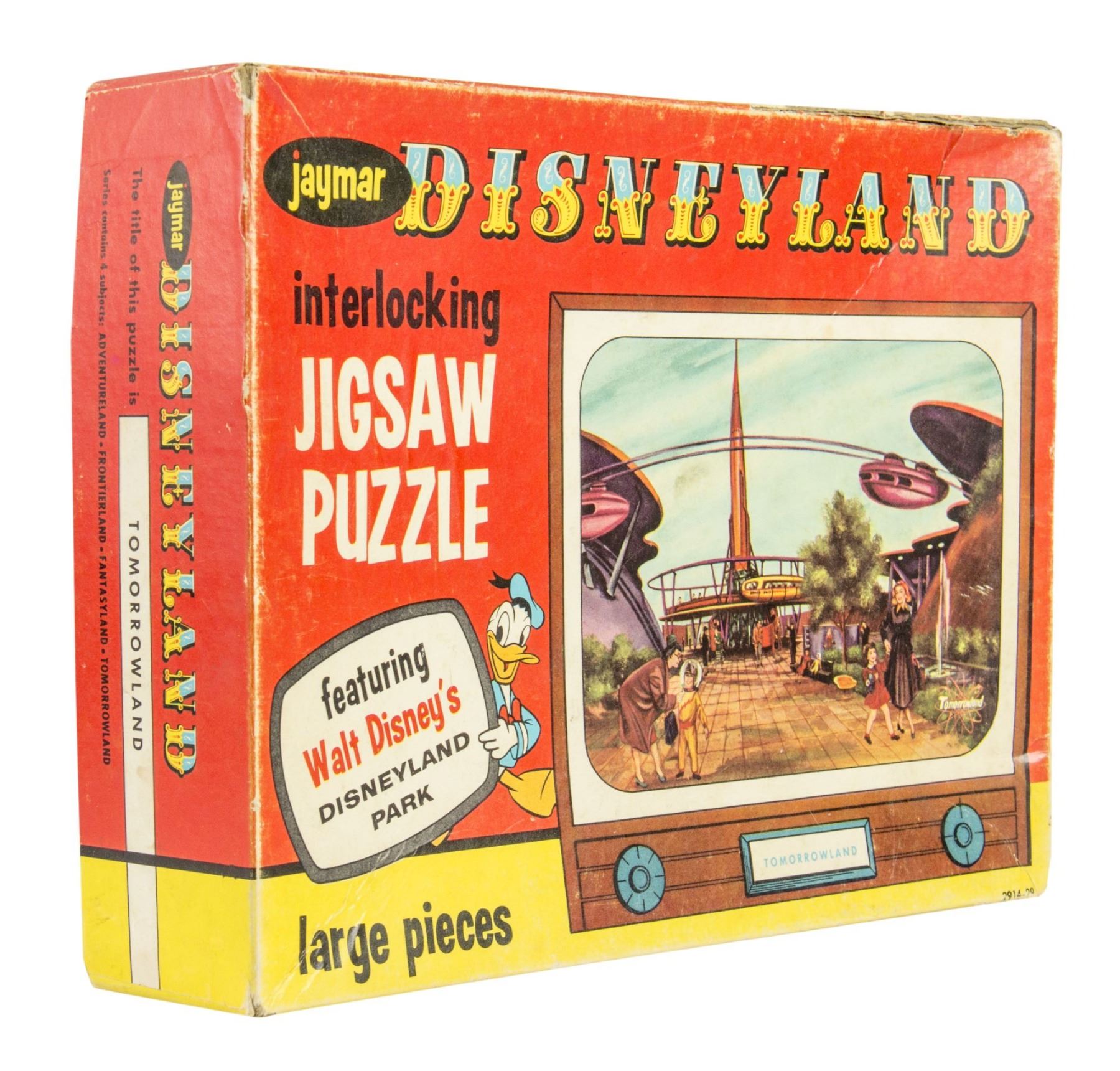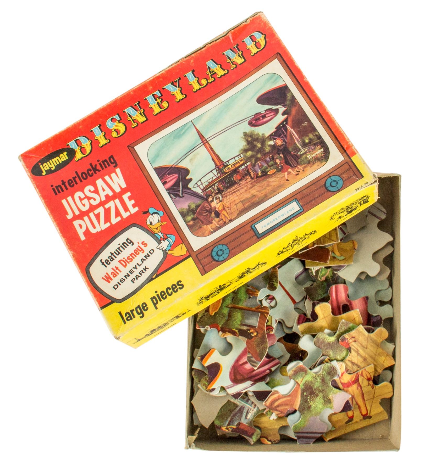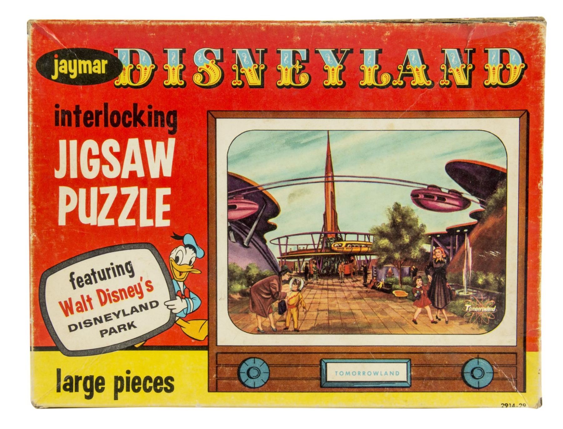 (Disneyland, c.1955) A Tomorrowland-themed puzzle by Jaymar in its original box. The puzzle appears to have all of its original pieces, and features great imagery of the early Tomorrowland attractions. The box measures 7.75"x10" and 2.5" thick, and is in good condition with some wear to the box.
