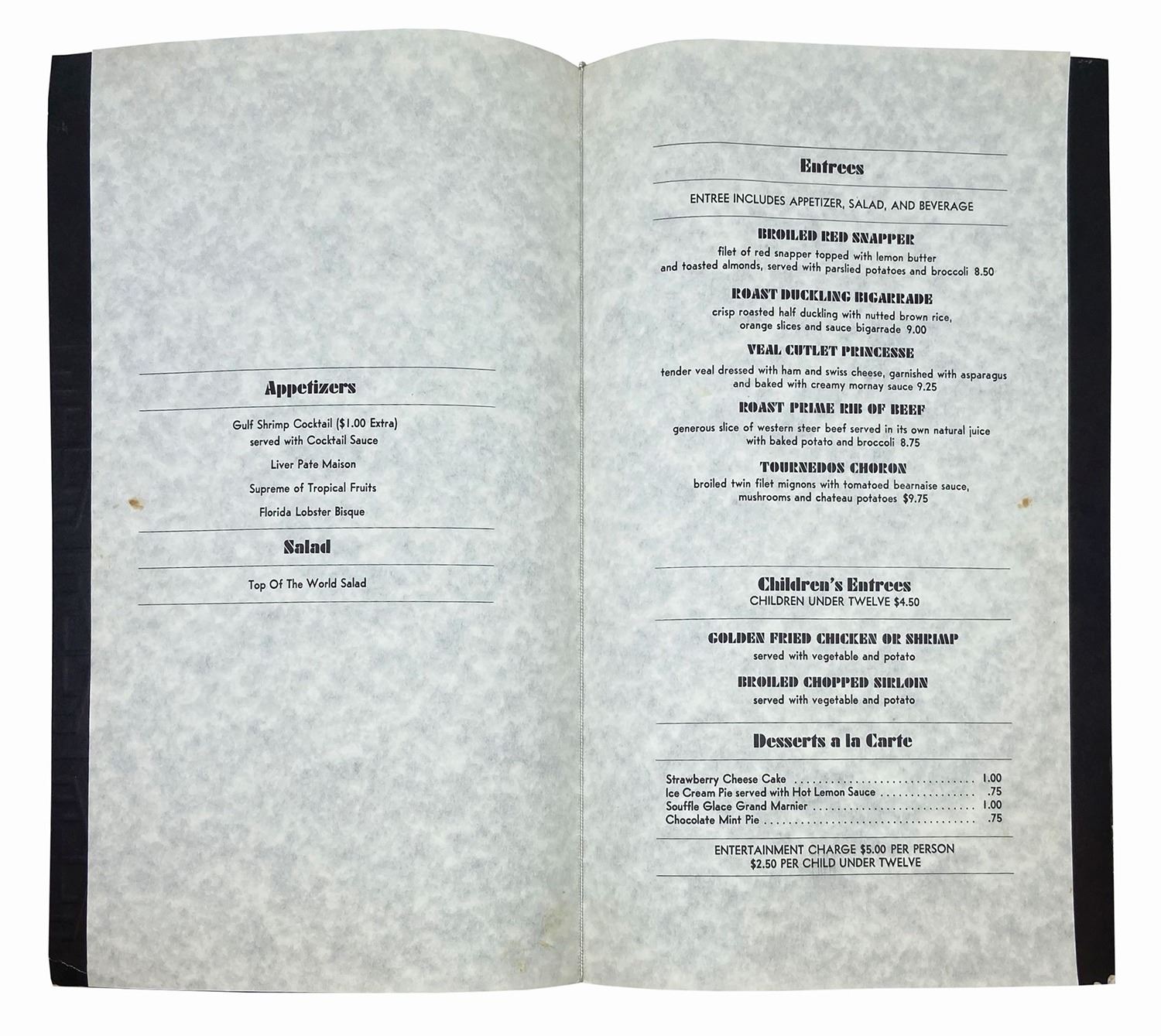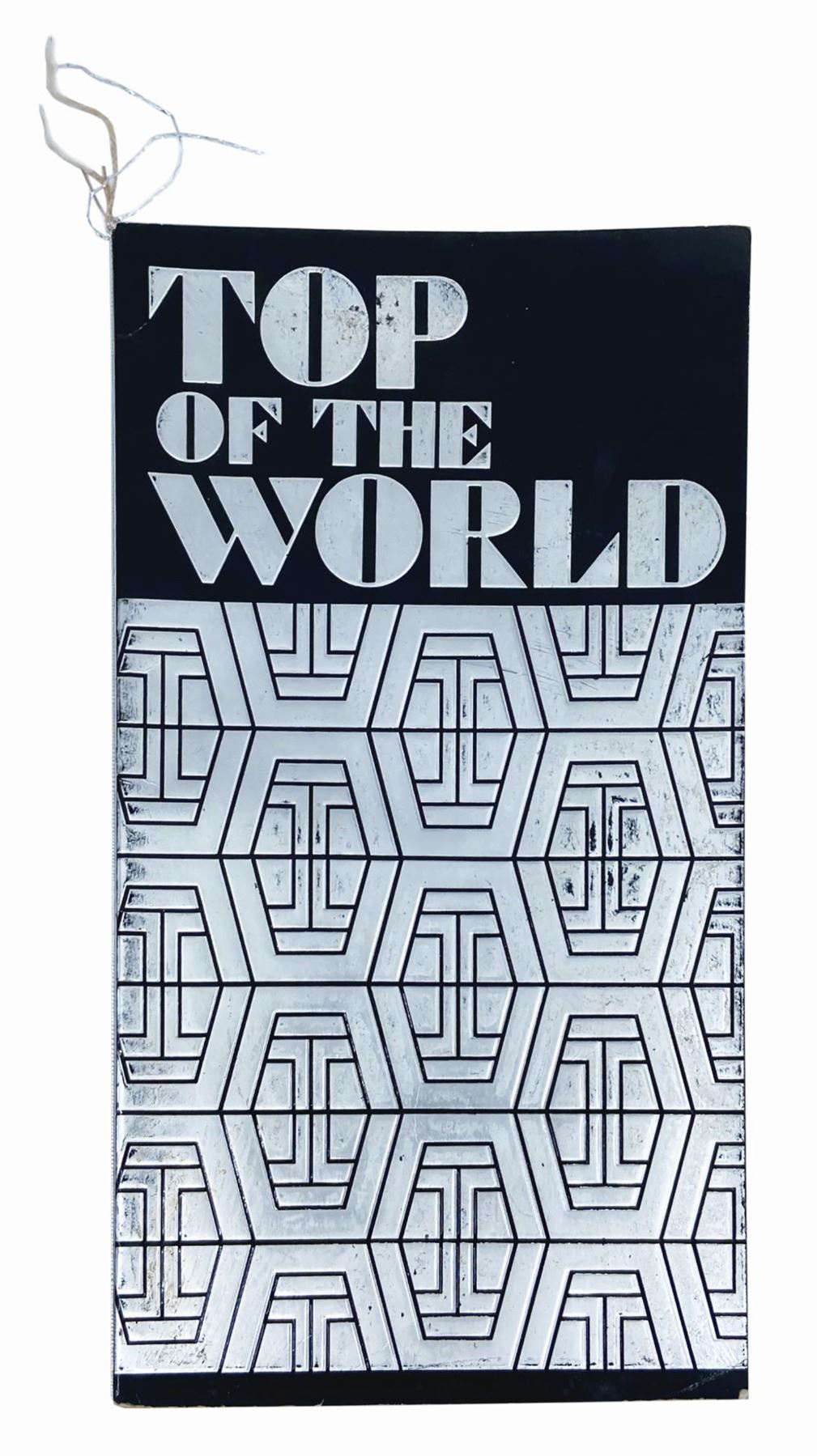 (Contemporary Resort, c.1970s) An early menu from the Top of the World restaurant at the Contemporary Resort. This menu features a silver and black color scheme, with a geometric pattern on the cover, with the original menu sheet still inside. Measuring 13"x7.75", the menu is in fair condition with moderate edge-wear, surface wear to the silver ink, and fraying to the band around the fold.