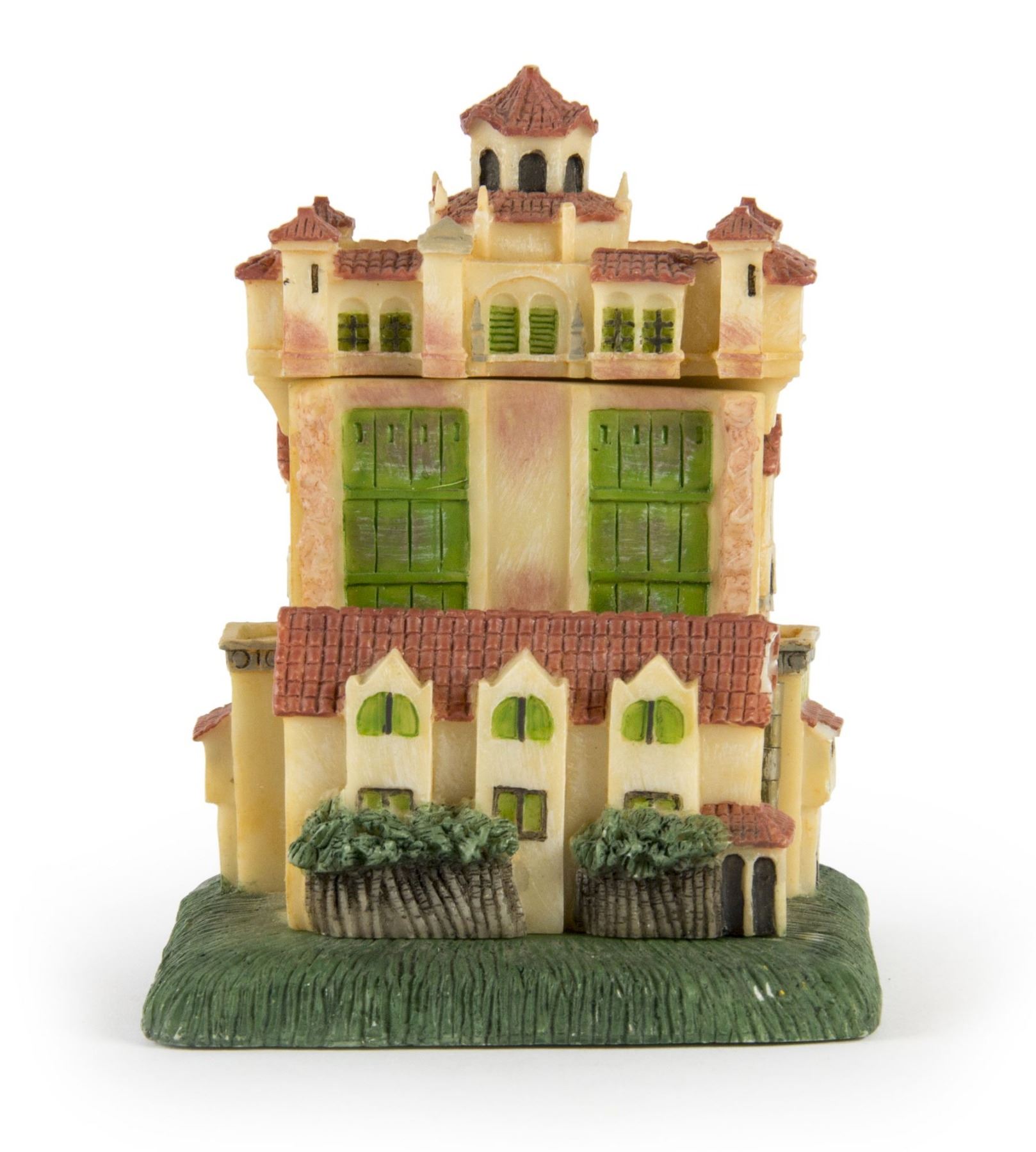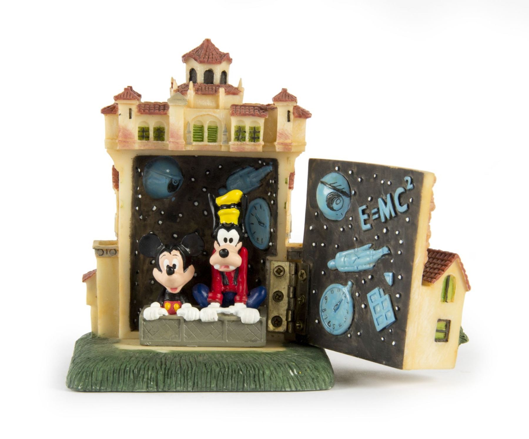 (California Adventure, c.1995) A miniature resin box modeled after the "Tower of Terror" attraction. The hinged front of the box opens to reveal additional attraction-based scenes inside, as well as a Mickey and Goofy figure in an attraction vehicle. This item measures 3.5"x3.25" and 4.5" tall and is in good condition with minor wear throughout.