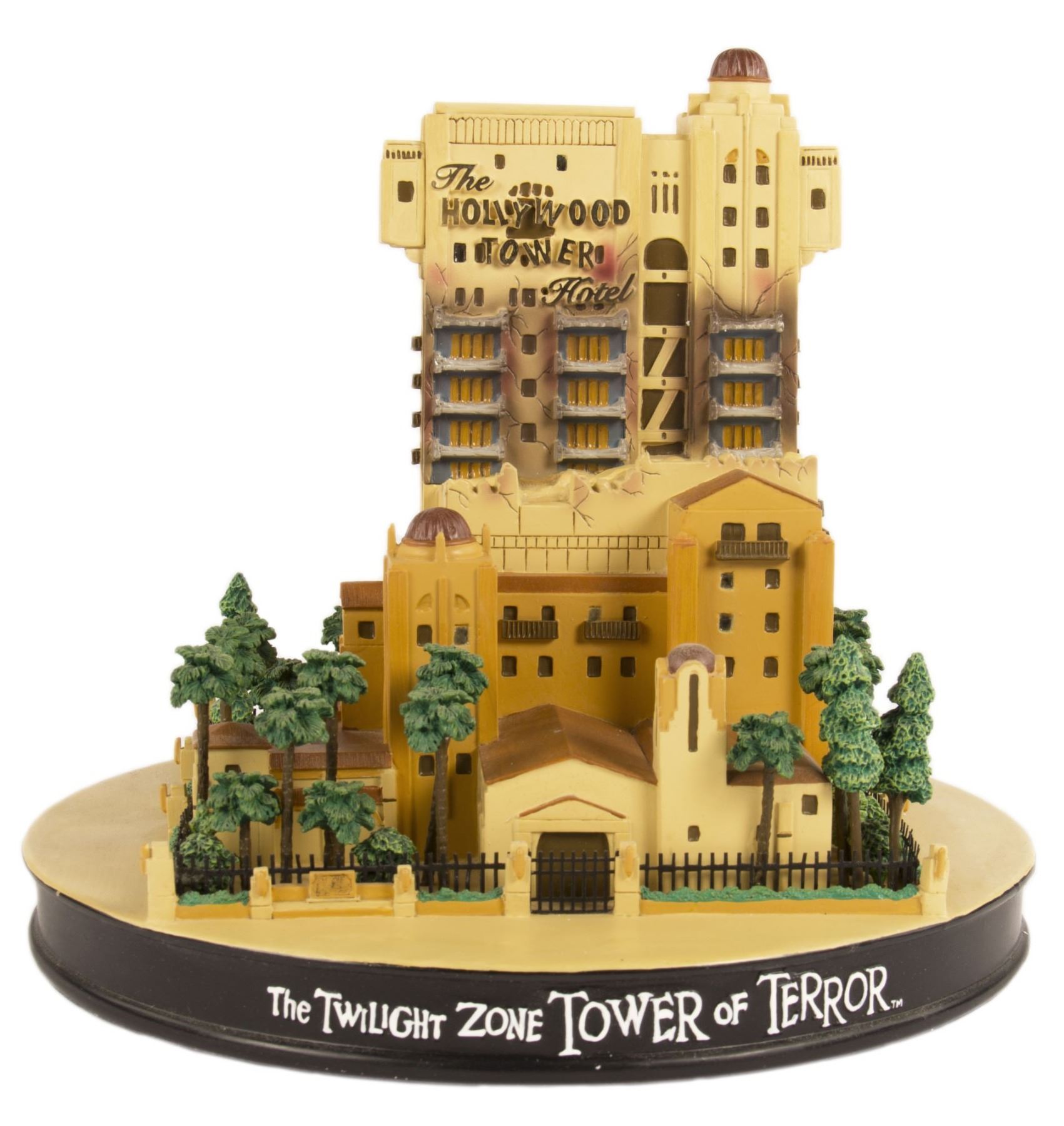 (California Adventure, c.2010s) A beautiful model of California Adventure's Twilight Zone Tower of Terror attraction building. The battery powered model lights up in areas, and is a wonderful recreation of this popular attraction. Measuring 10" in diameter and 8" tall, the model is in very good condition overall with minor wear from previous display.