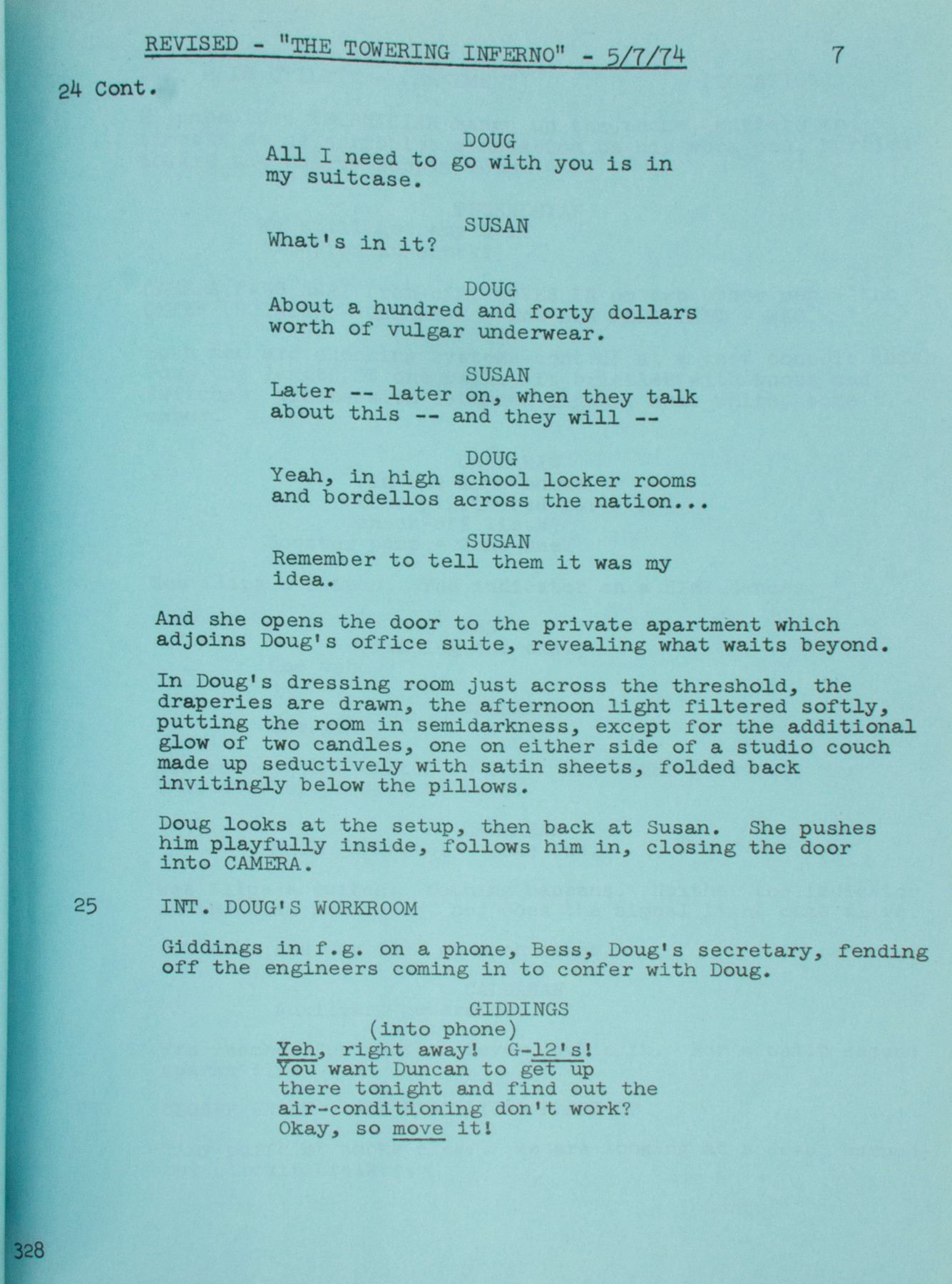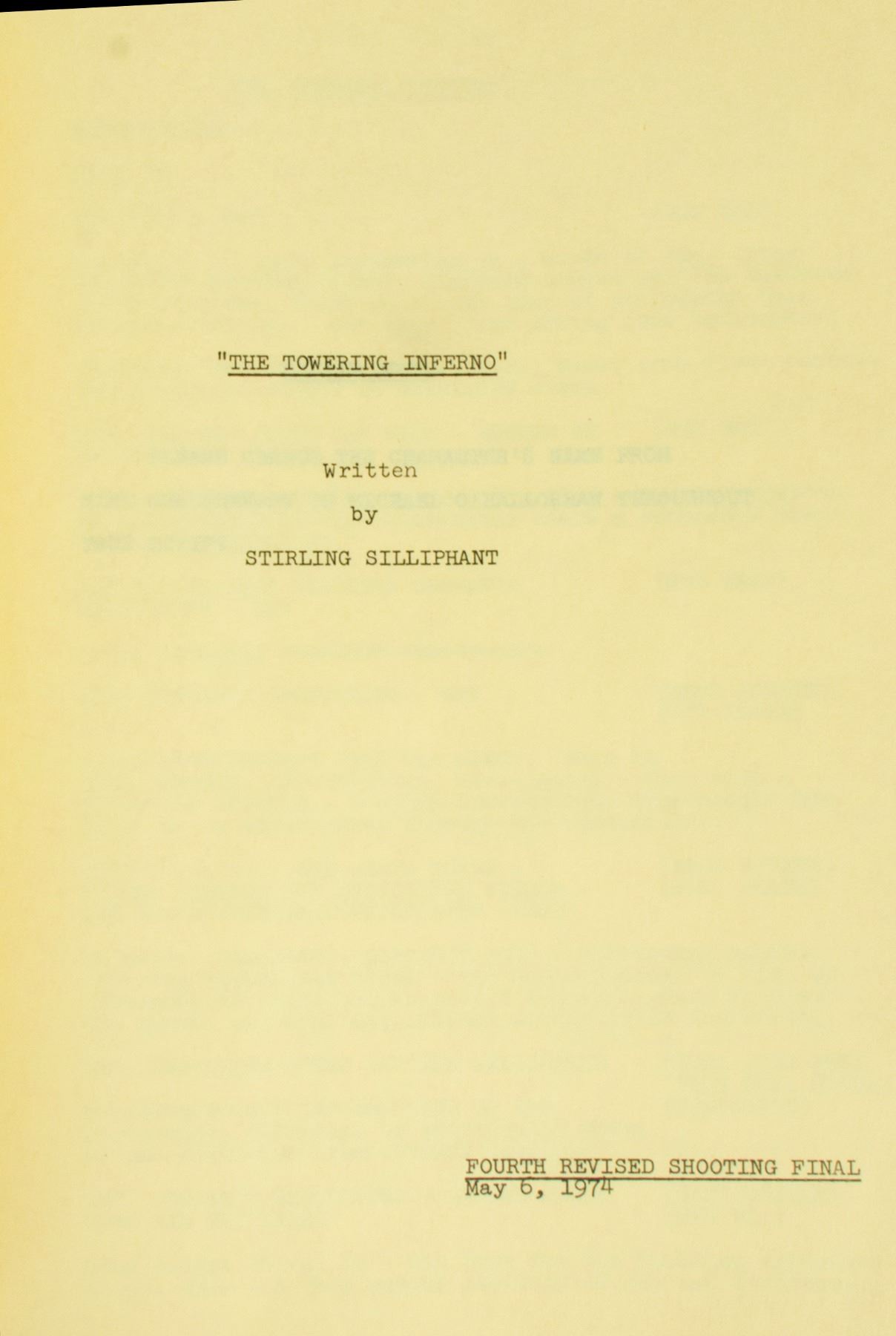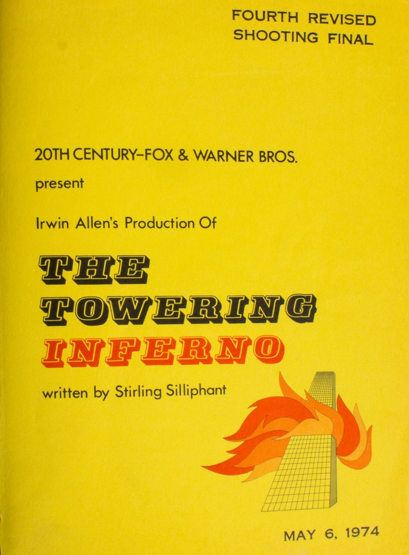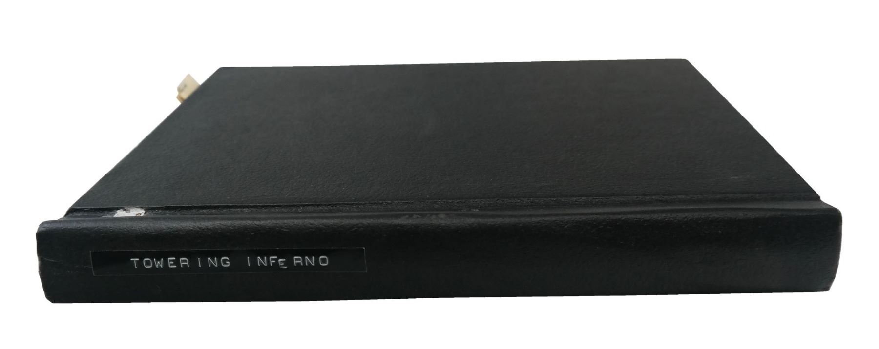 (20th Century Fox, 1974) A very rare script for the feature film "The Towering Inferno". Dated May 6, 1974, this rare script comes from the collection of Bill Wallen, who helped design and create promotional and advertising campaign materials for the film. The script comes in a protective hardcover binding with the title typed along the spine, as used and stored by Wallen. The 167-page script provides a fantastic look into the production of this iconic film, and measures 11.5"x9.25". The condition is good with minor cover wear, and some minor page wear from use.