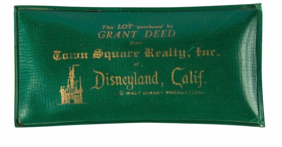 (Disneyland, c.1955) A very rare souvenir bag of dirt from the Town Square Realty shop on Main Street. This early Disneyland lessee promoted growth and development within Southern California, and this souvenir bag of dirt features the store's name on the front with the Disneyland logo. The dirt would be accompanied by a "deed" which certified that dirt as California dirt and featured an embossed logo in the lower-corner. This dirt does not come with the deed, but is still a beautiful example of this extremely rare early park souvenir. The backside of the package is clear so that the dirt can be viewed. This item measures 2"x4" and is in very good condition with little wear.