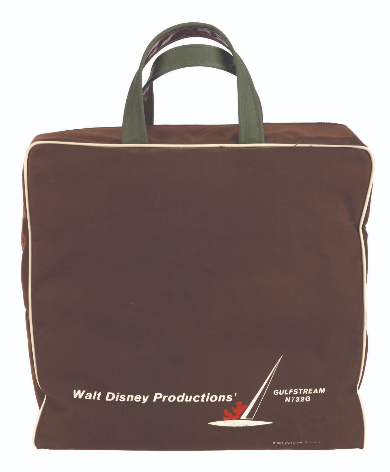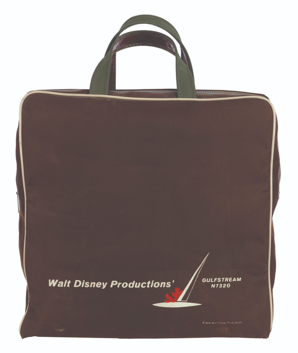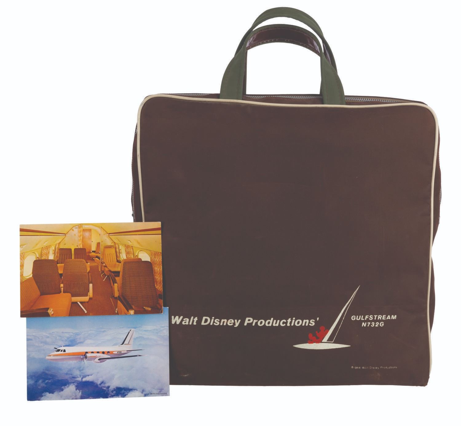 (Disney, 1964) A travel bag and postcards given to early passengers of the Disney Company plane. In 1963, Walt Disney used a demonstration Gulfstream aircraft to scout potential locations for a second Disney theme park. The company acquired its own Gulfstream plane in 1964, and Walt and Lillian Disney both had a hand in the interior design, with the cabin seating 15 passengers in deluxe comfort. Early passengers were lucky to receive this themed travel bag featuring A Walt Disney Productions logo depicting Mickey on the tail of the plane, and a pair of postcards showcasing the plane’s interior and exterior. Measuring 5” x 12” x 16” tall, the vinyl and nylon travel bag is in very good condition with light wear from age and handling, including small scuffs, and a .5” cut in the surface low on one side. The postcards measuring 3.5” x 5.5” are in very good condition with light edge and corner wear.