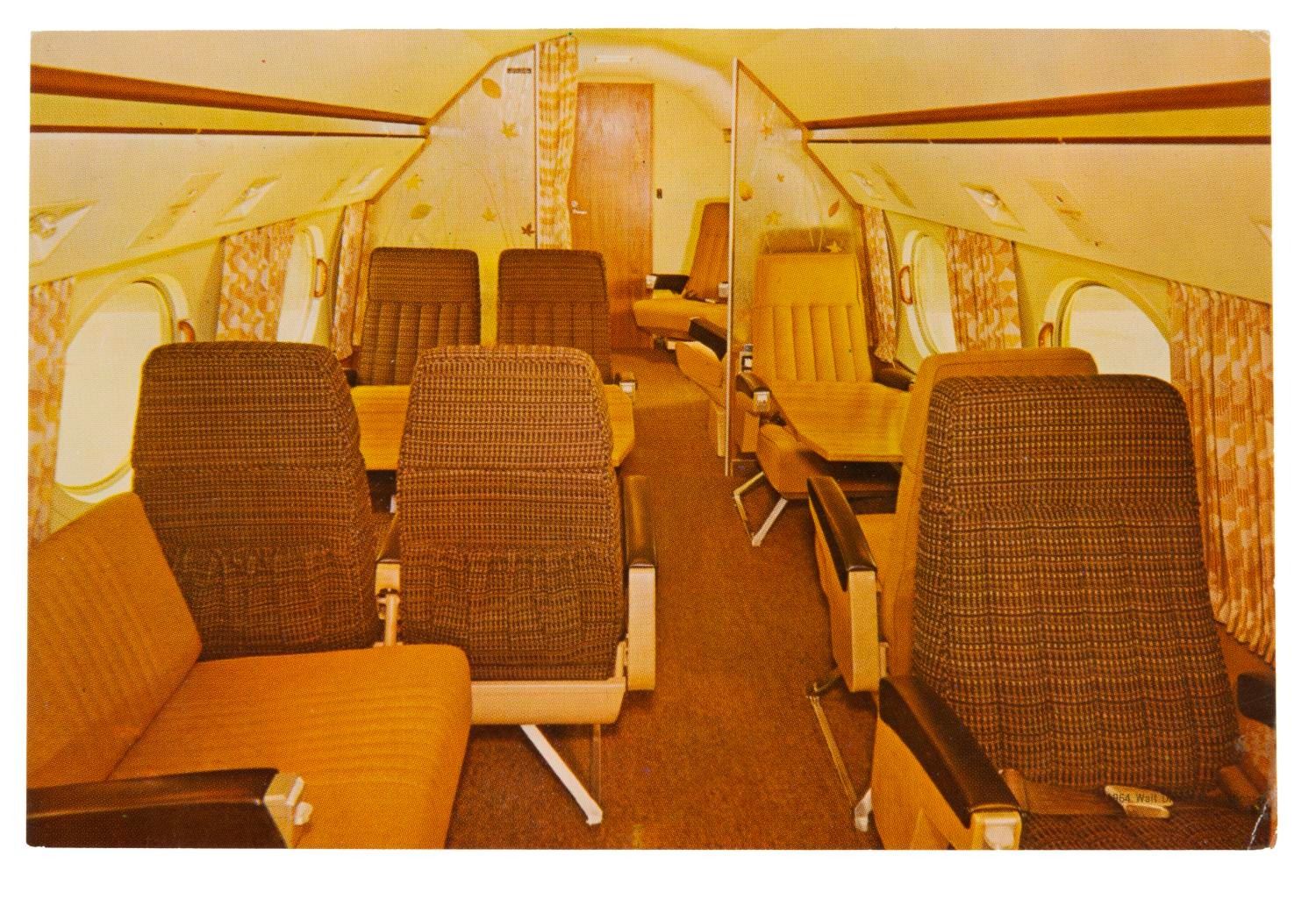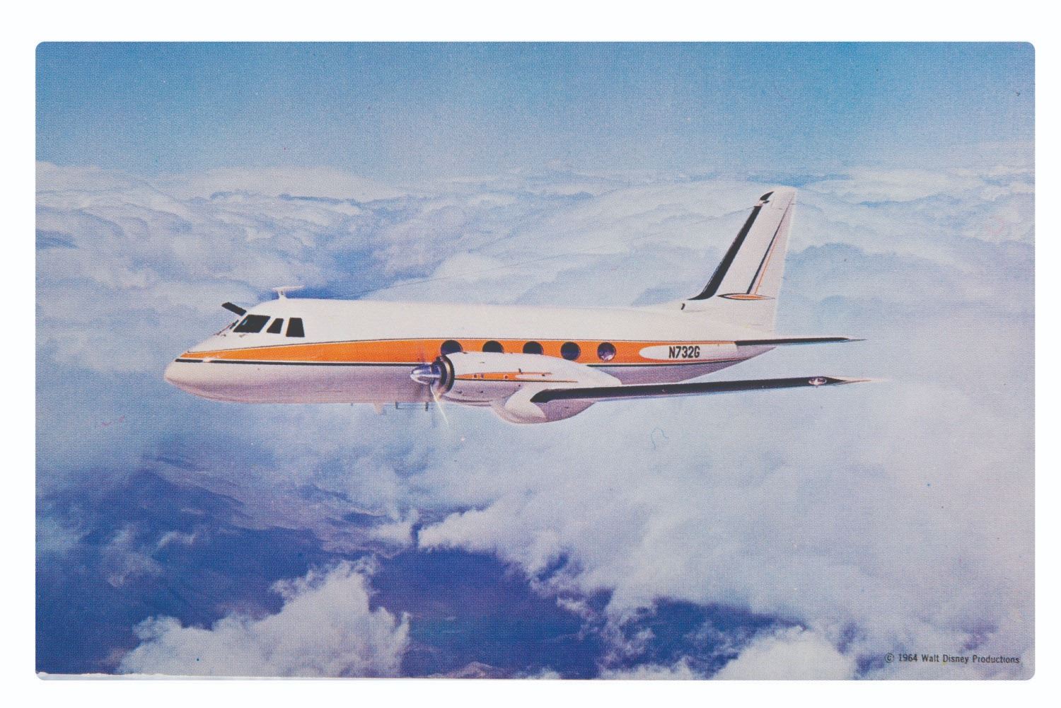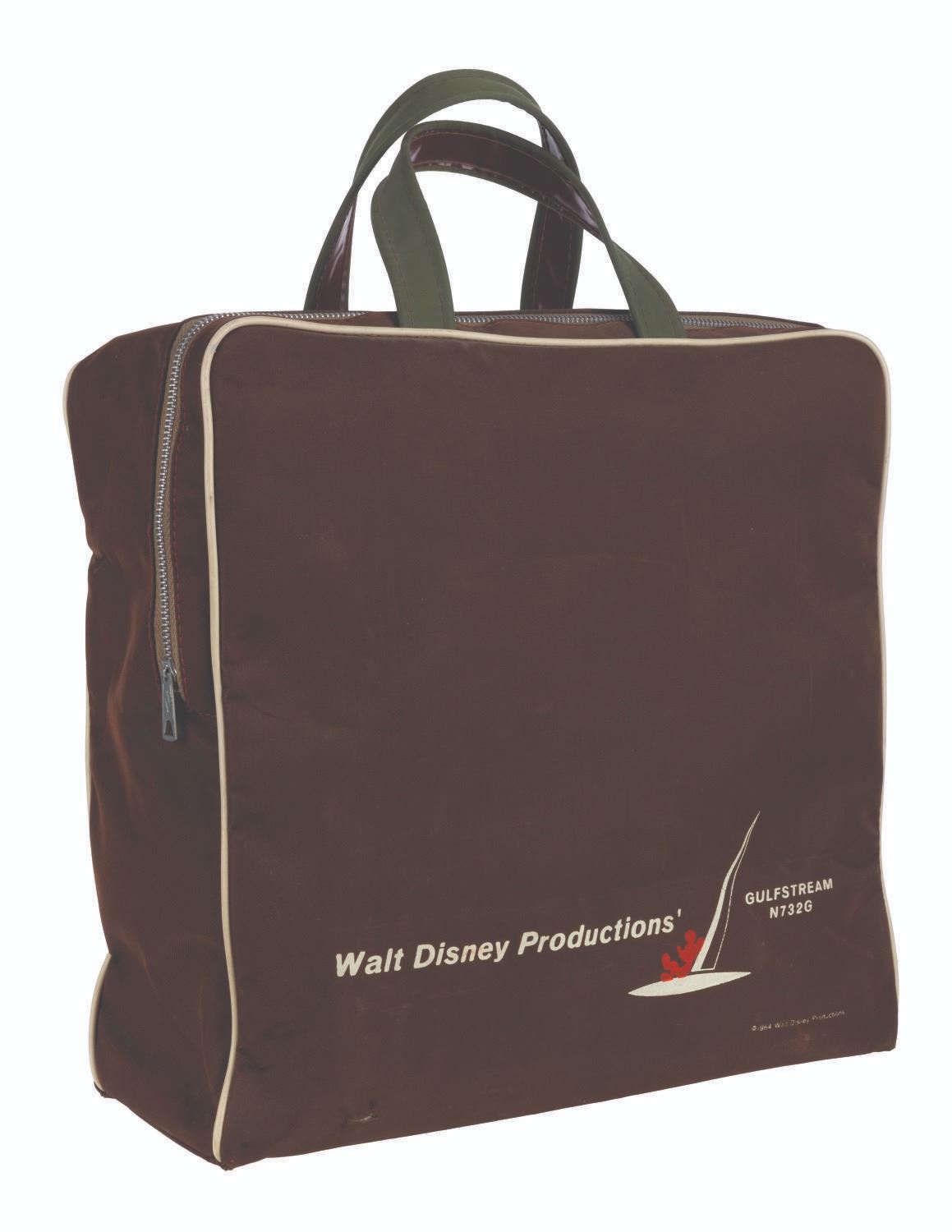 (Disney, 1964) A travel bag and postcards given to early passengers of the Disney Company plane. In 1963, Walt Disney used a demonstration Gulfstream aircraft to scout potential locations for a second Disney theme park. The company acquired its own Gulfstream plane in 1964, and Walt and Lillian Disney both had a hand in the interior design, with the cabin seating 15 passengers in deluxe comfort. Early passengers were lucky to receive this themed travel bag featuring A Walt Disney Productions logo depicting Mickey on the tail of the plane, and a pair of postcards showcasing the plane’s interior and exterior. Measuring 5” x 12” x 16” tall, the vinyl and nylon travel bag is in very good condition with light wear from age and handling, including small scuffs, and a .5” cut in the surface low on one side. The postcards measuring 3.5” x 5.5” are in very good condition with light edge and corner wear.