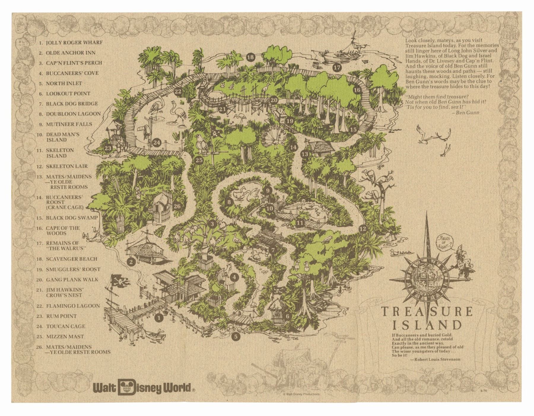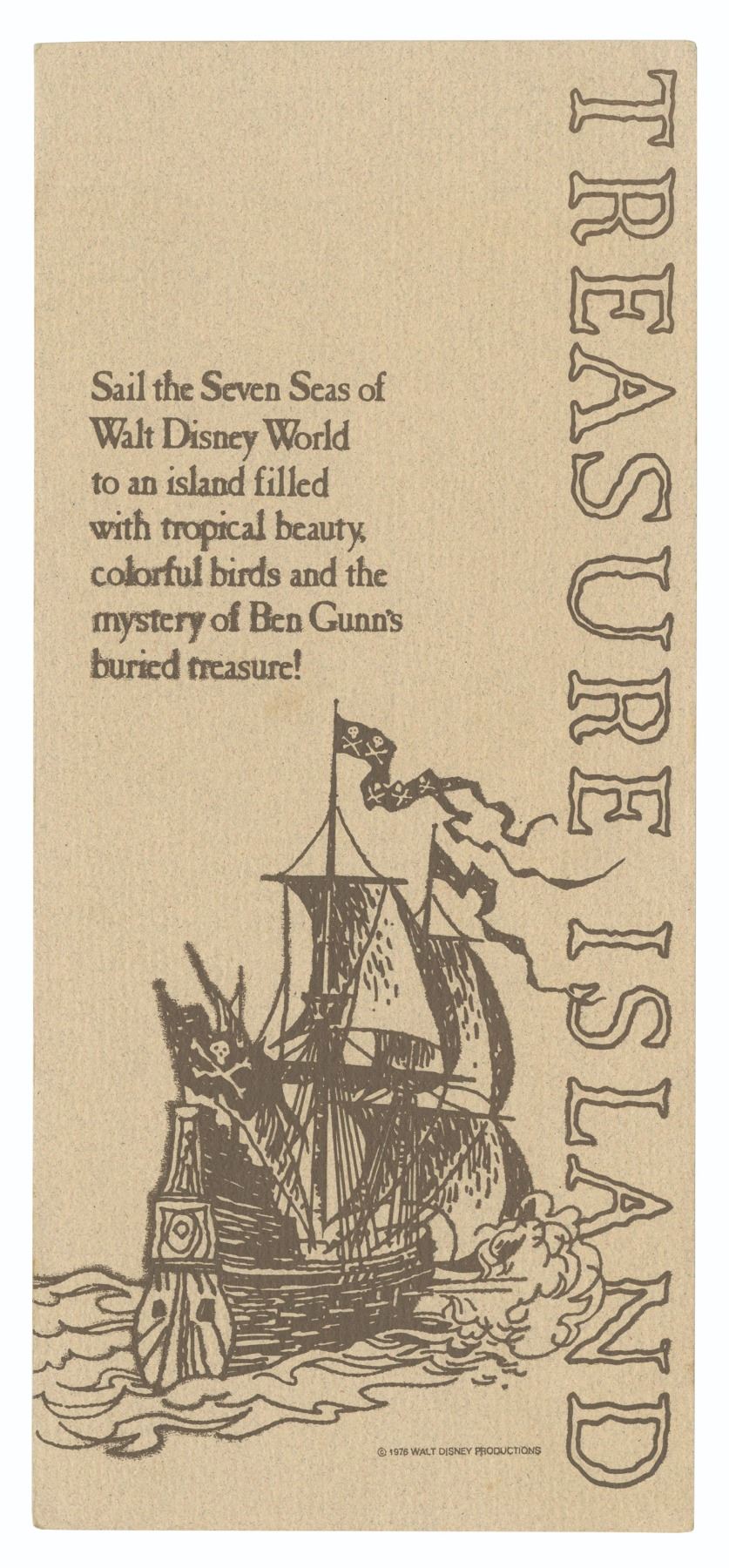 (Discovery Island, 1976) A rare tri-fold map and guide for the Treasure Island attraction. The cover features an illustration of a pirate ship and a reference to the original Treasure Island story. The map opens to reveal a hand-drawn, overhead view of the island, with a directory of 26 points of interest in the left margin. Measuring 9"x4" folded, the map is in very good condition with some blurring of the ink on the front and back.