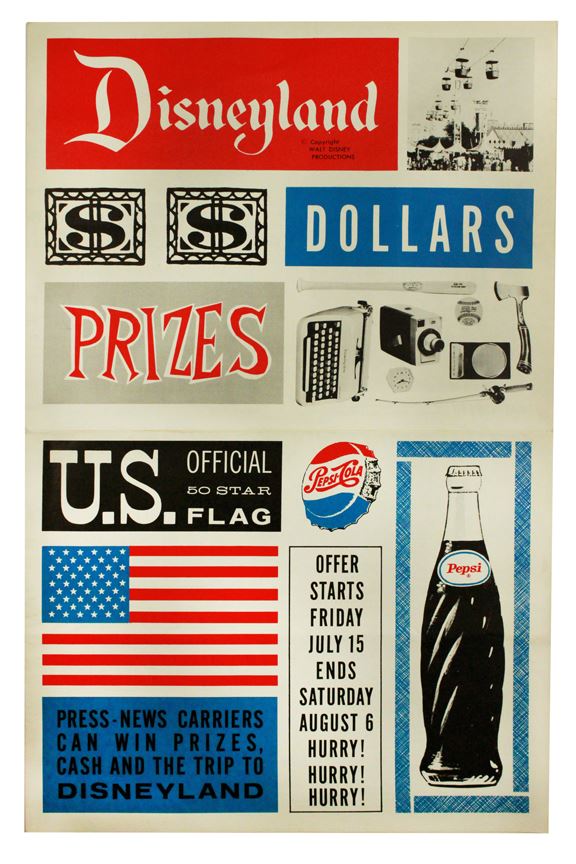 (Disneyland, 1960) Large poster-like informational folder on a Pepsi-Cola sponsored contest for a trip to Disneyland for press carriers in 1960. The large format has tons of great graphics and info on the park. Measuring 17 x 11 in. and in very good condition.