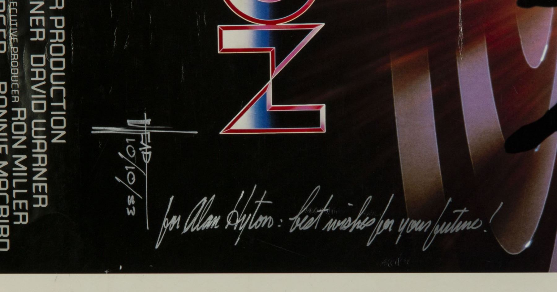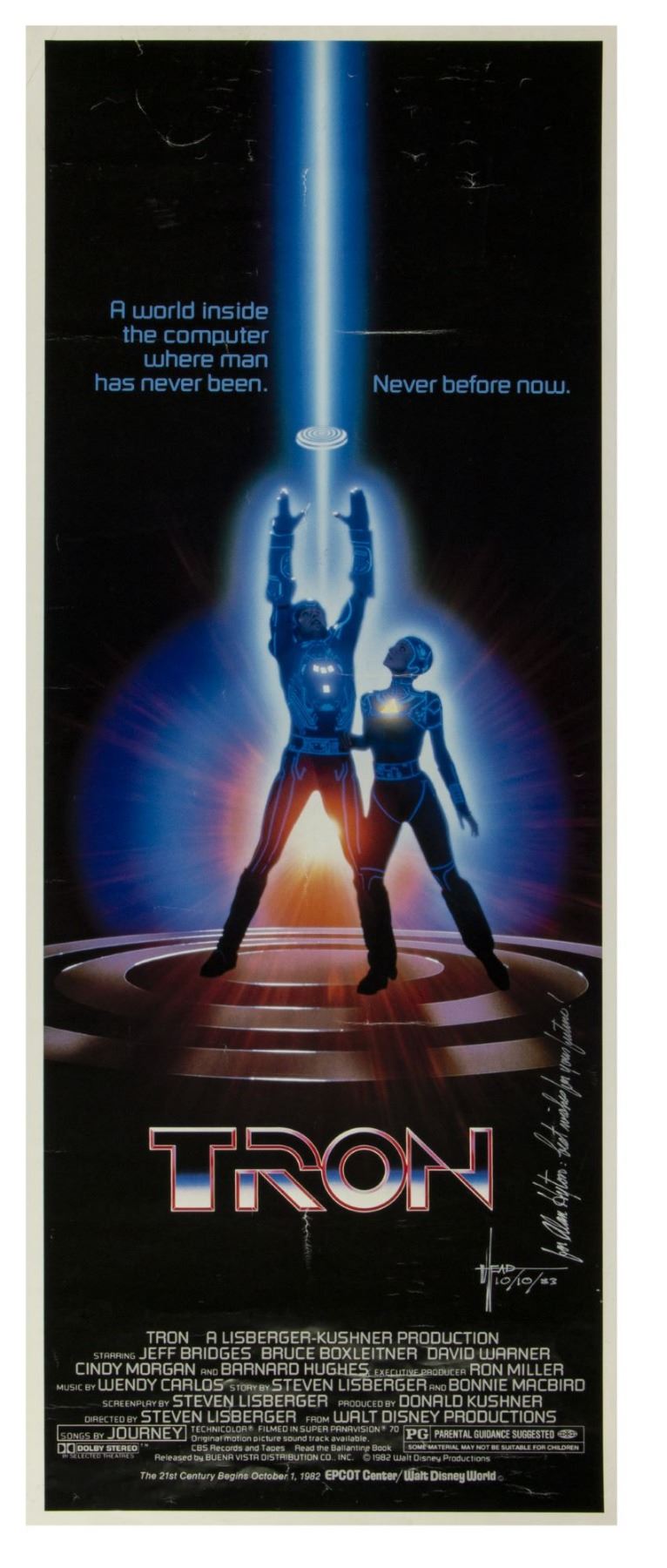 (Disney, 1982) A rare insert sized poster for the Walt Disney feature film "Tron" that has been signed by renowned concept artist Syd Mead. The poster was printed on cardstock and features gorgeous imagery that captures the mood of the film. The poster is signed "For Alan Hylton, Best Wishes for Your Future" and is signed and dated by Mead 10/10/83. Measuring 36"x14", the poster is in fair condition with creases throughout, wear around the edges, and some areas of discoloration to the back side. The area near the top-edge has the most wear, and a tear along the top-edge has been repaired on the back side with tape. Insert sized posters for this film are very rare, and one signed by the concept artist who helped bring this film to life is even more so.