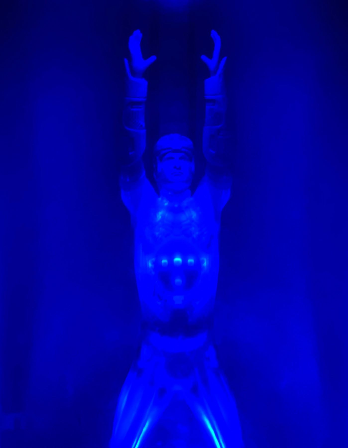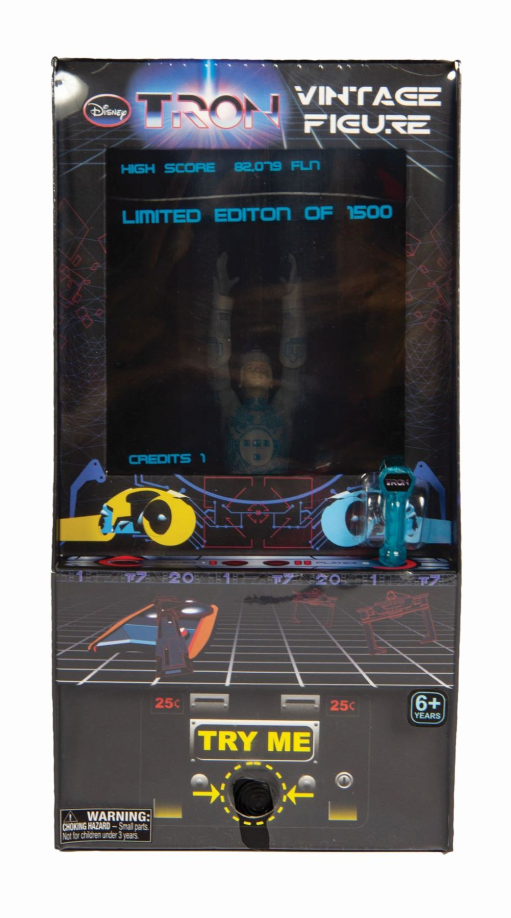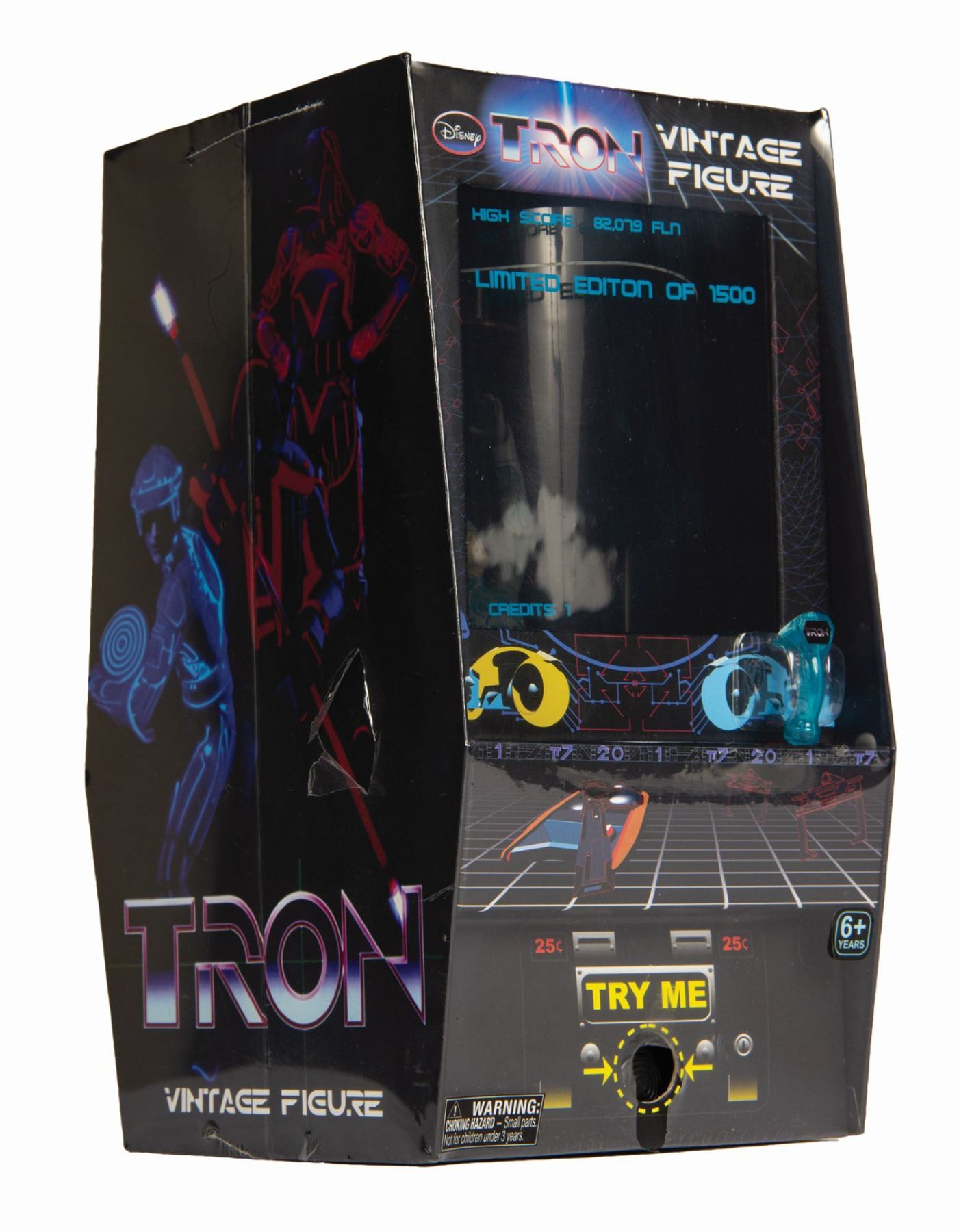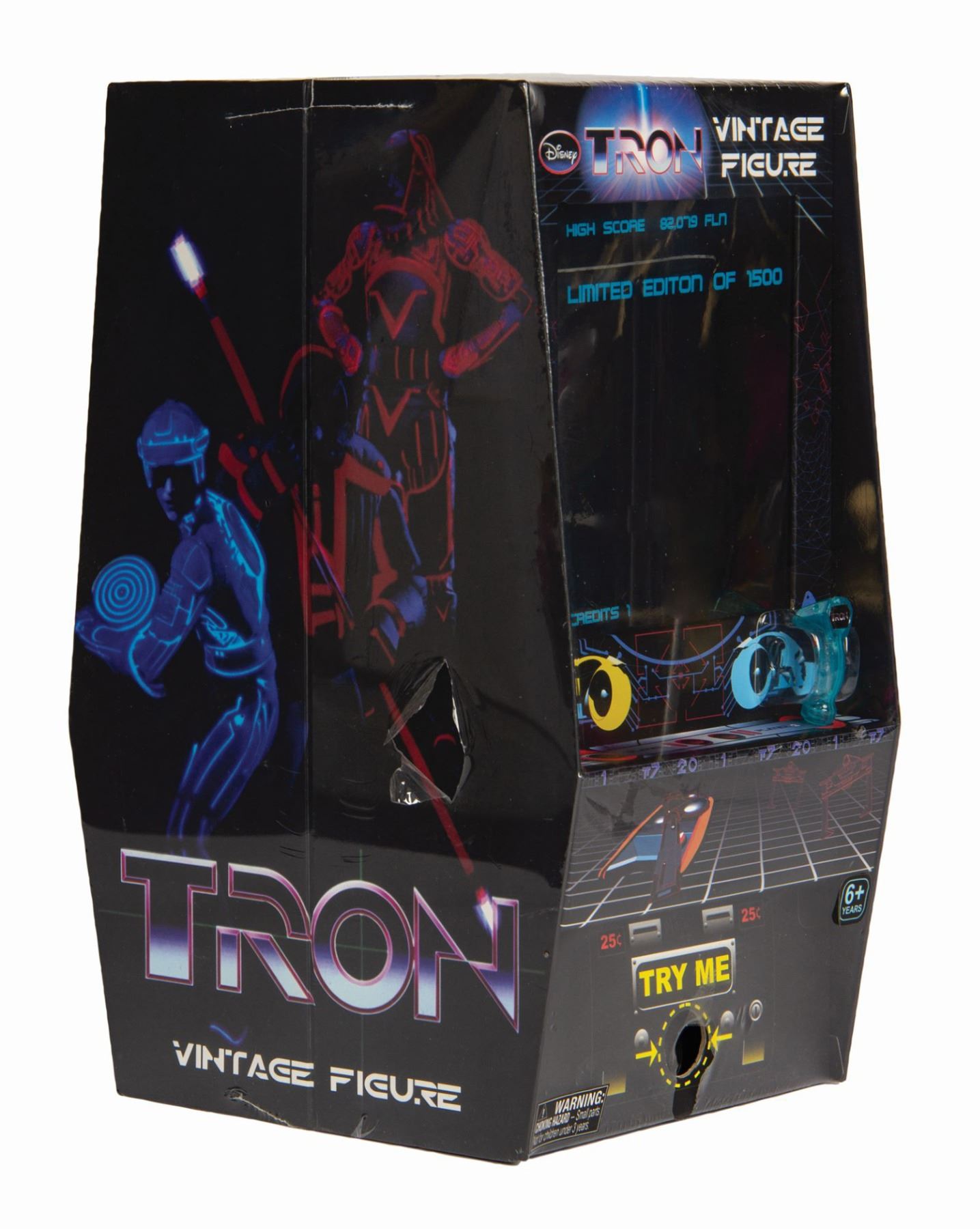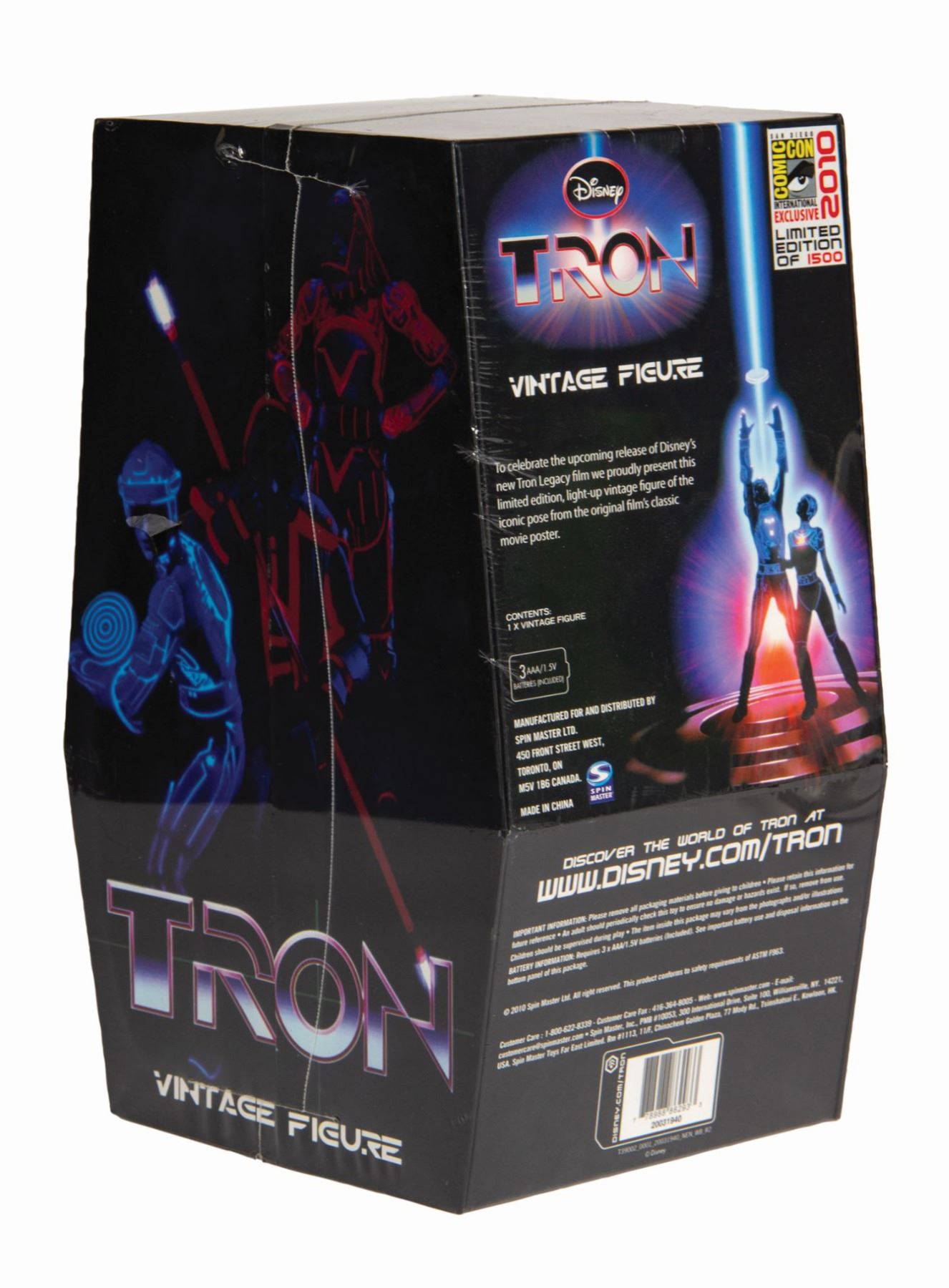 (Disney, 2010) A limited edition light-up figure created by Spin Master Ltd. in celebration of the release of Tron Legacy. The figure was a San Diego Comic Con exclusive and was limited to only 1500 pieces. Housed within a Tron arcade cabinet-style box, the figure was designed to resemble the iconic pose from the original Tron theatrical poster. The figure is still wrapped in plastic, and the "try me" button still activates the lights within the cabinet. Measuring 8"x6.25" and 12" tall within the cabinet, the figure is in very fine condition with minor shelf wear including a few small tears in the plastic wrap.