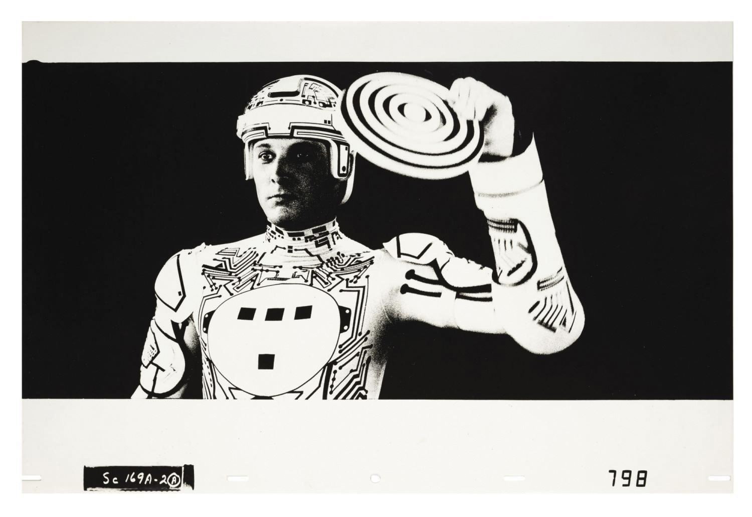 (Disney, 1982) An original photostat printed effects layer from Tron. Featuring Bruce Boxleitner as the character clutching an identity disc, the photostat layer was used to help create the film's unique look. The ground-breaking film predated modern day computer animation and effects, requiring its unique lighting effects to be hand-created frame by frame. This painstaking process was only used for Tron, making the film's effects artwork a special piece of cinema history. Measuring 12.5"x20" overall, the photostat layer is in very fine condition.