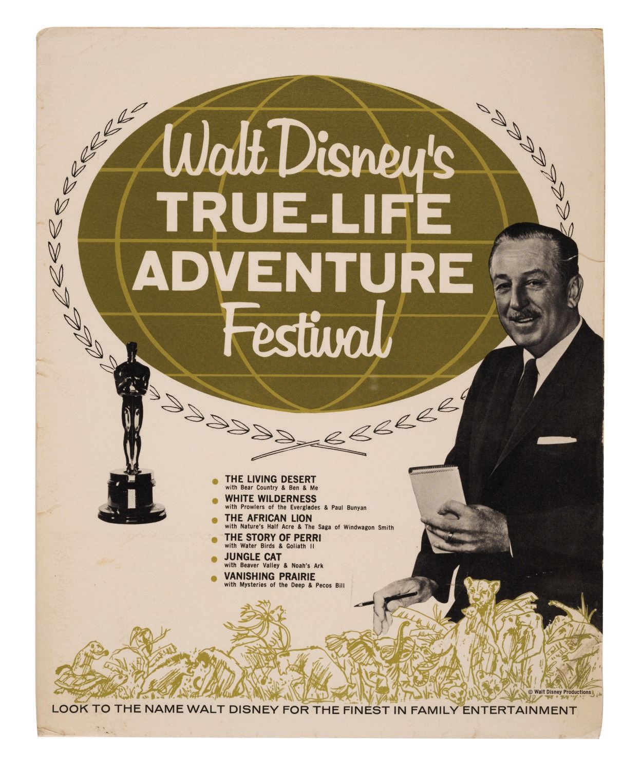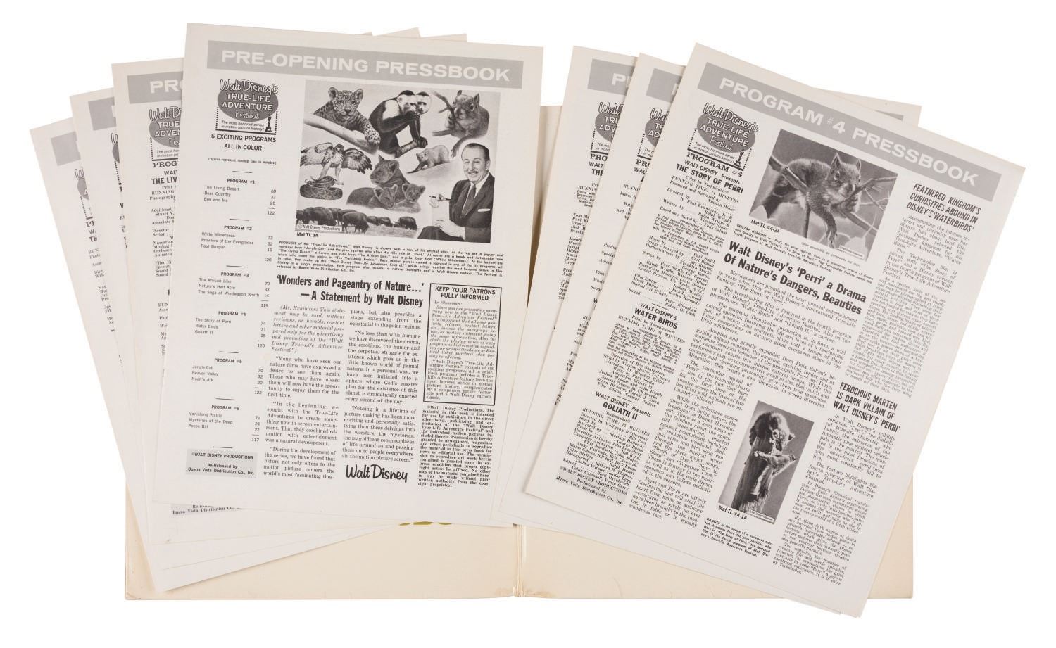 (Disney, 1964) A True-Life Adventure Festival Campaign Manual. A total of seven Pressbook materials come inside a folder for Walt Disney's True-Life Adventure Festival. This was a program to rerelease 6 weeks of True-Life Adventure features, each matched with a True-Life short and a Disney animated short. Measuring approximately 11"x14", the folder and contents are in very good condition, exhibiting some creases and wear to edges and corners.