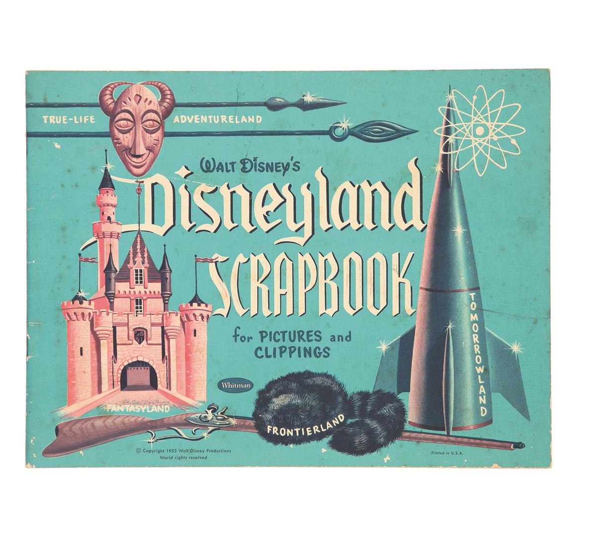 (Disneyland, 1955) A very rare, unused Disneyland Scrapbook by Whitman from the opening year of the park. Cover features imagery from the different lands, and interior pages were to be filled with "pictures and clippings". Measures 8.4"x11". 28 pages. In good condition with some edge and cover wear, and small spots of light staining.