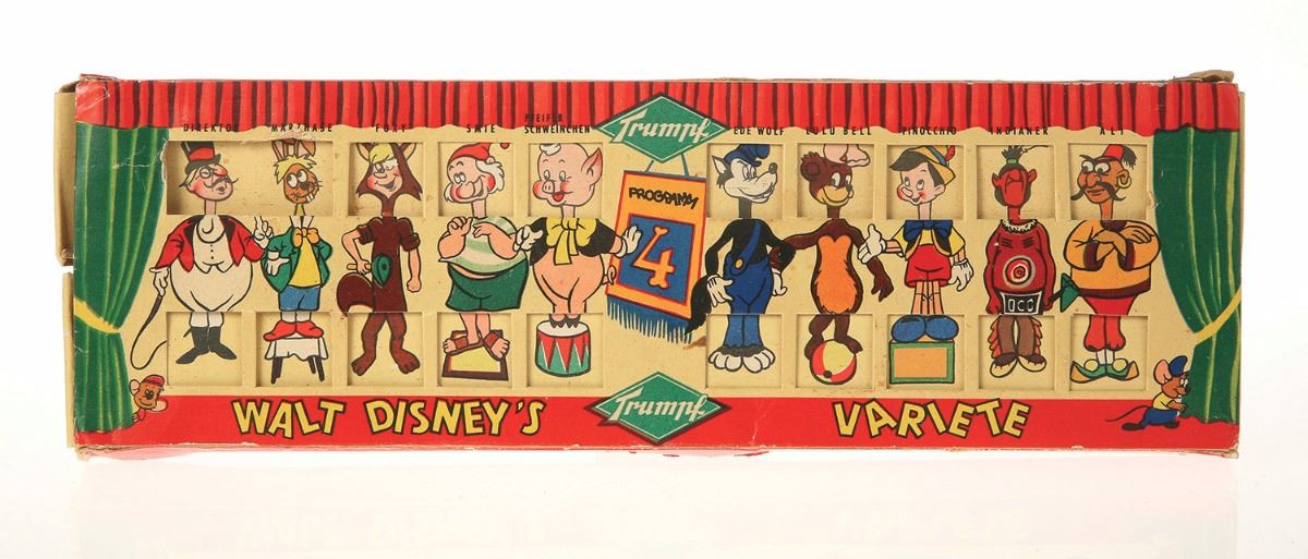 (Trumpf, 1960s) Created for the promotion of the German brand Trumpf chocolates in the 1960s, this sliding character program allows the owner to slide different heads and feet over the 20 character bodies. Double-sided, this is "programm 3 & 4" of the set. Measures 3"x9.25"x0.5". In good condition with some wear throughout.