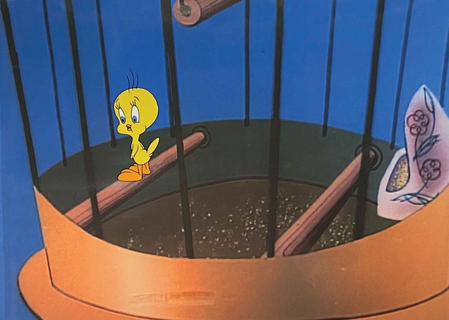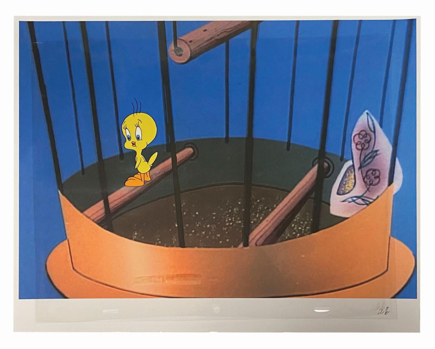 (Warner Bros. 1956) An original hand-painted production cel of Tweety Bird from the Merrie Melodies animated short "Tree Cornered Tweety." Presented on a matching printed background, the cel depicts Tweety delivering his famous catchphrase, “I tawt I taw a puddy tat!” after he spies Sylvester hanging out the window of the apartment across the way. The cel has an image size of 3.5"x1.5" on the 10.5”x13.5” cel sheet. It is in very good condition with faint pigment loss to some black outlining. It retains a partial Warner Bros. copyright label at lower left.