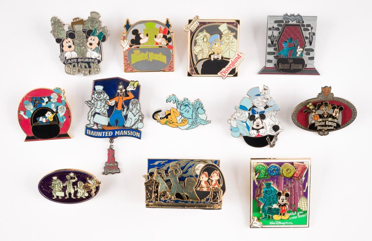 (Disneyland/ Walt Disney World, 2004-08) A collection of twelve pins featuring Disney Characters encountering the Haunted Mansion's Hitchhiking Ghosts. Included are limited edition, First Release, Cast and Annual Passholder Exclusive pins, and pins from Tink's Summer Pin Quest and Mickey's Pin Odyssey. Each pin is in very good condition with light handling wear.