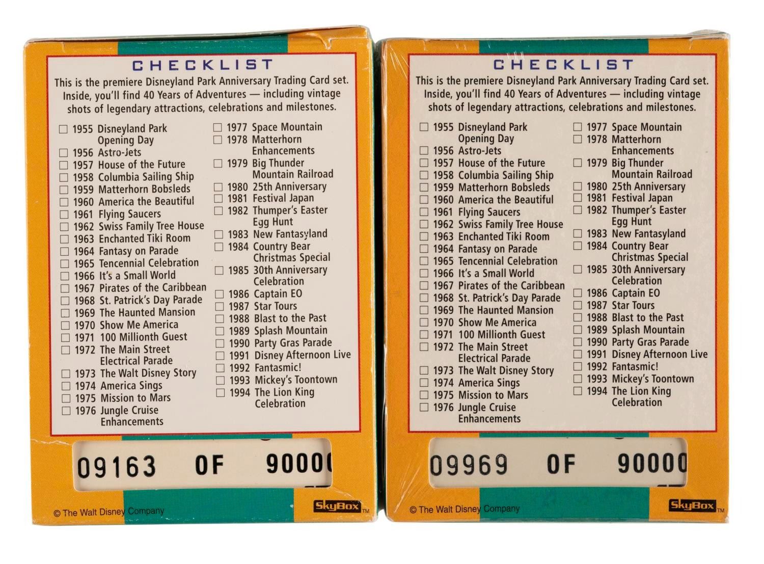 (Skybox, 1994-1995) A pair of Collectors Series Trading Cards commemorating Disneyland's 40 Years of Adventure anniversary and one 1995 Indiana Jones Adventure card. Measuring 2.5" x 3.5", the cards are in very good to fine condition with one box unopened and in the original wrapping, and the opened cards have minimal edge wear. The Indiana Jones Adventure Card is in fine-sleeved condition.