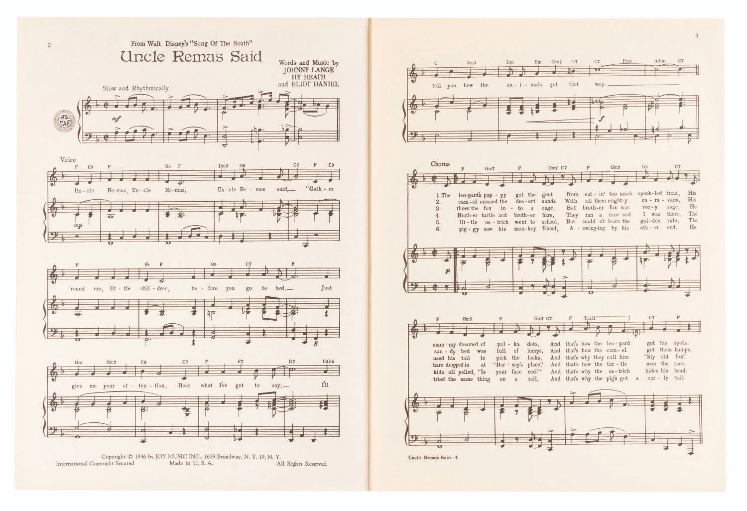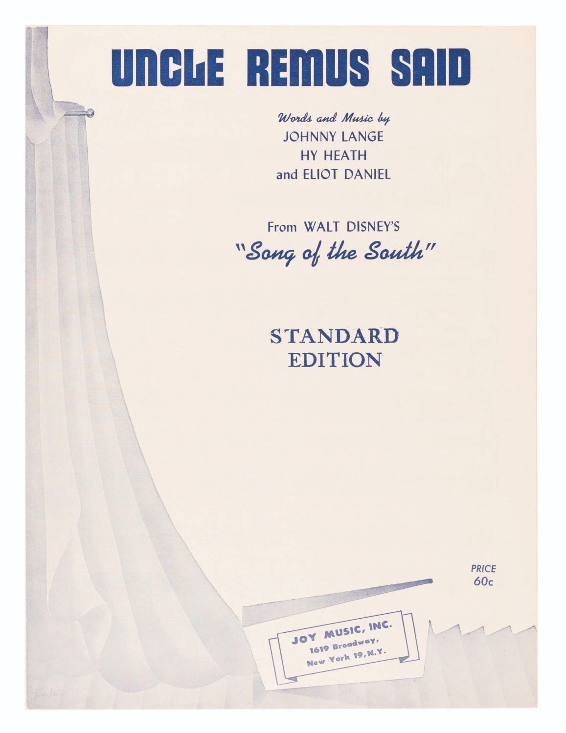 (Joy Music, Inc., 1956) Sheet music for “Uncle Remus Said” from Walt Disney's “Song of the South,” with words and music by Johnny Lange, Hy Heath, and Eliot Daniel. Measuring 9” x 12”, the sheet music displays in very good condition with light creases and discoloration from age.