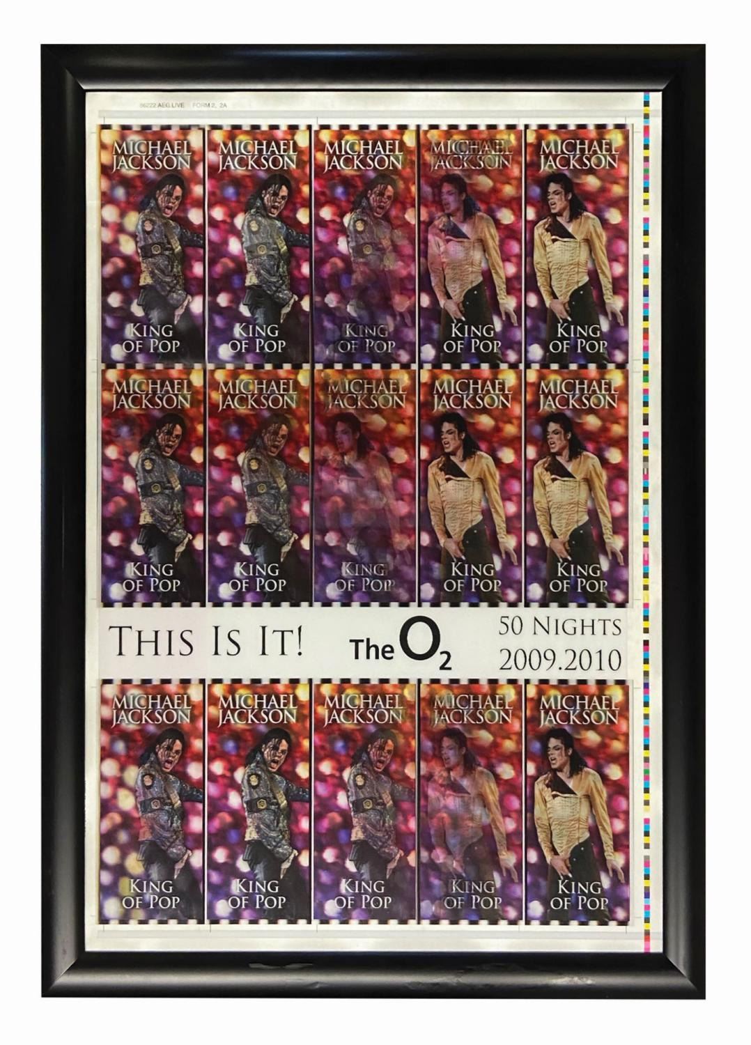 (Jackson, 2009) An incredibly rare uncut sheet of lenticular concert tickets for Michael Jackson's planned "This is It" concert series at the O2 Arena in London. The concerts ultimately never took place, as Jackson passed away on June 25, 2009, just weeks before planned July 13, 2009 start of the concert series. These uncut lenticular tickets are among the seldom surviving artifacts from this significant moment in Michael Jackson history. Measuring 27.75"x19.5" within their 30.75"x22.5" frame, the tickets are in very fine unused condition.