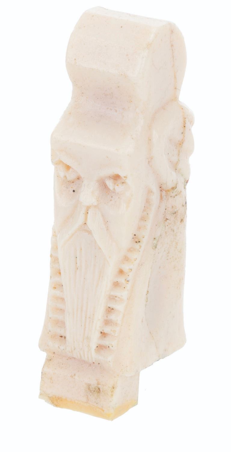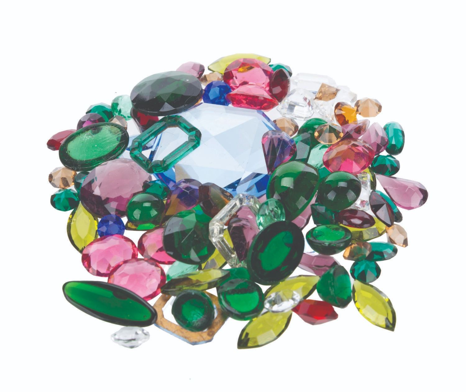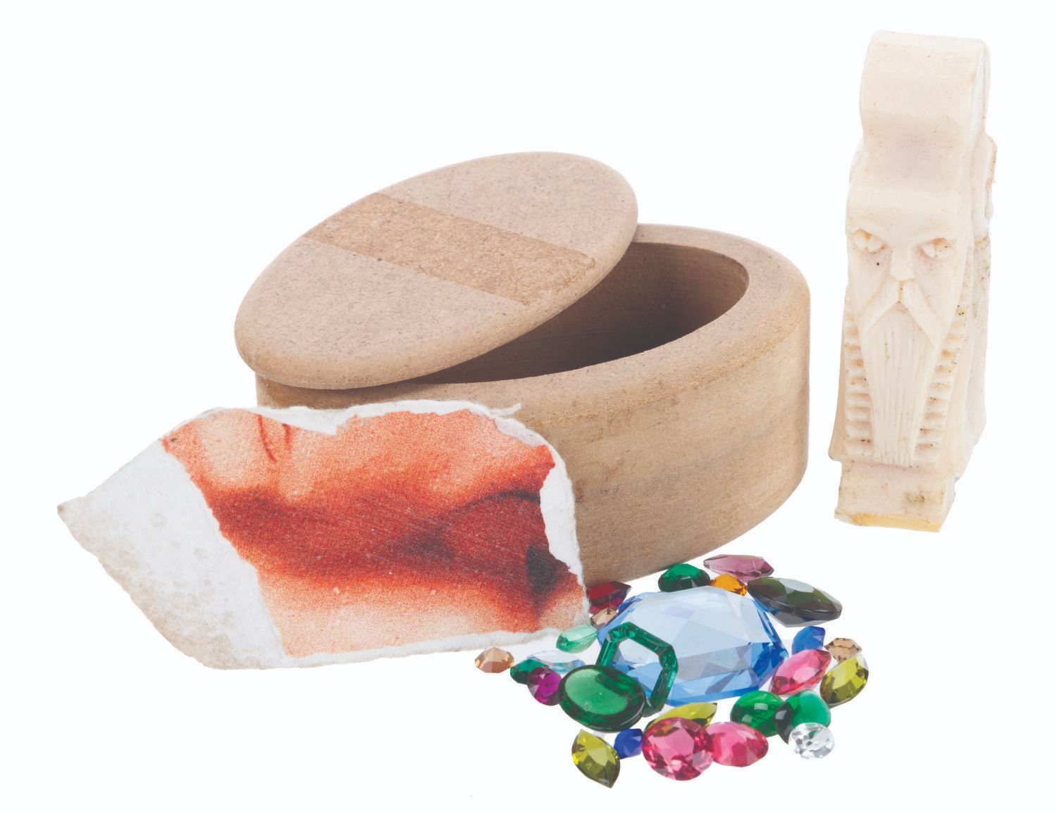 (Warner Bros., 2012-14) A collection of screen-used and unfinished props from The Hobbit trilogy. Screen-used pieces include 99 Erebor treasure glass jewels, and a 3.25" x 1.75" section of the damaged Master of Laketown portrait first seen in "The Desolation of Smaug, and destroyed in "The Battle of the Five Armies.” Also included are an unfinished wooden trinket box and a resin cast of a dwarf idol. Ranging in size from a 0.25” x 0.25” x 0.25” jewel to the 3.5” x 2.5” x 1.75” trinket box, the items are all in good to very good condition with handling wear and soiling from production use.