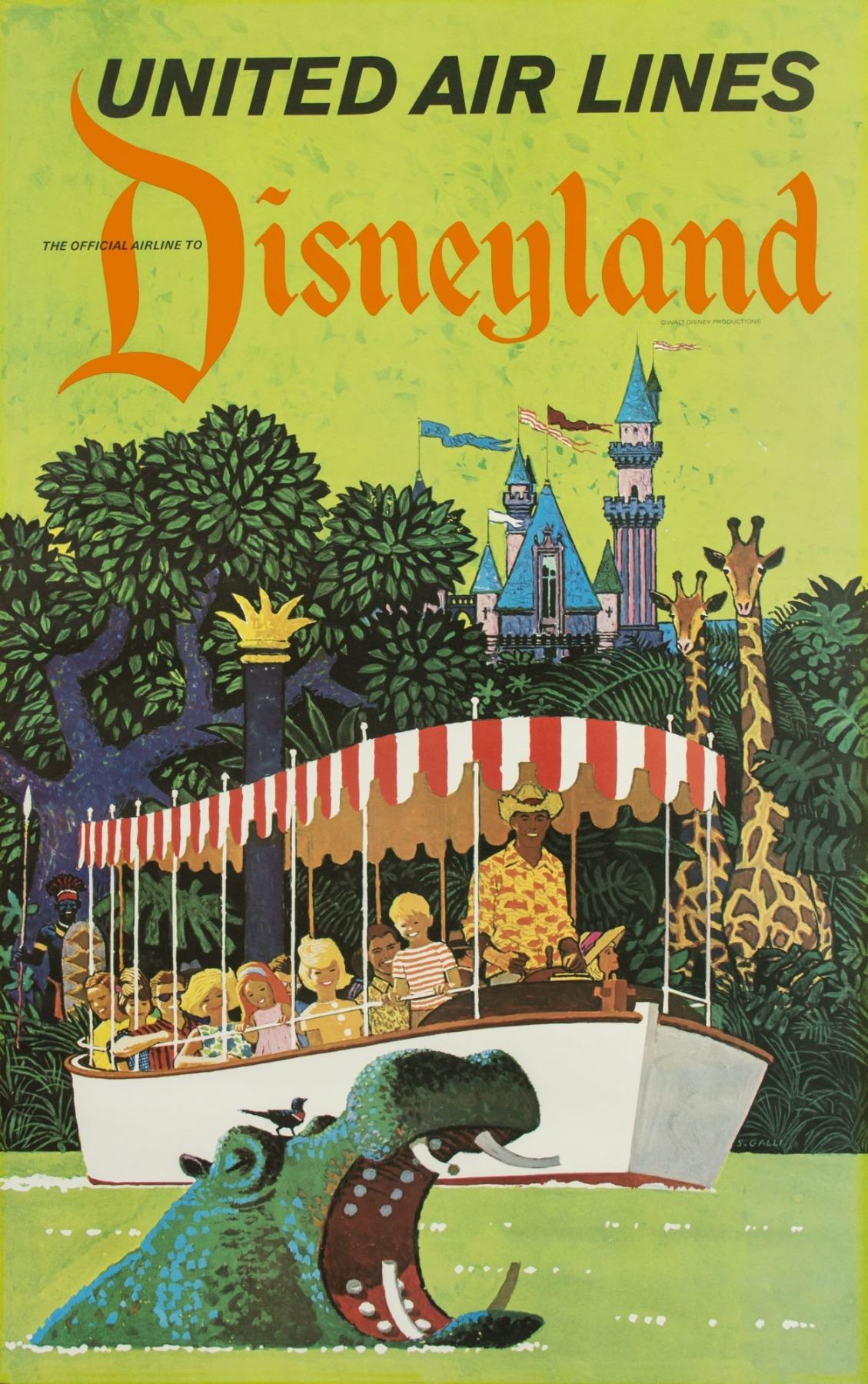 (Disneyland, 1963) An extremely rare travel poster produced by United Air Lines. Designed by Stan Galli, the 40"x25" poster features stunning imagery of the "Jungle Cruise" attraction with Sleeping Beauty Castle in the background. The condition is very good with minor discoloration from age.