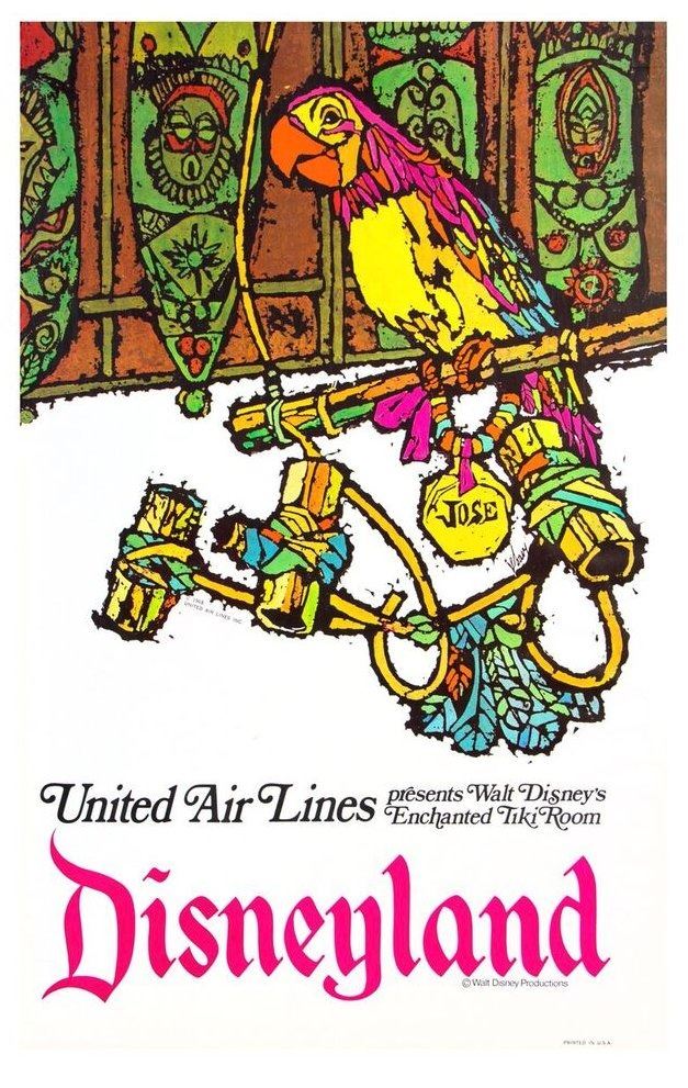 (Disneyland, 1968) An extremely rare poster by United Air Lines advertising the "Enchanted Tiki Room" attraction at Disneyland. This poster features a stylistic rendition of Jose, one of the four Masters of Ceremonies of the "Enchanted Tiki Room". This item measures 39"x25" and is in good condition with some edge-wear, including some minor spots of discoloration on the back and a slightly trimmed top-edge.