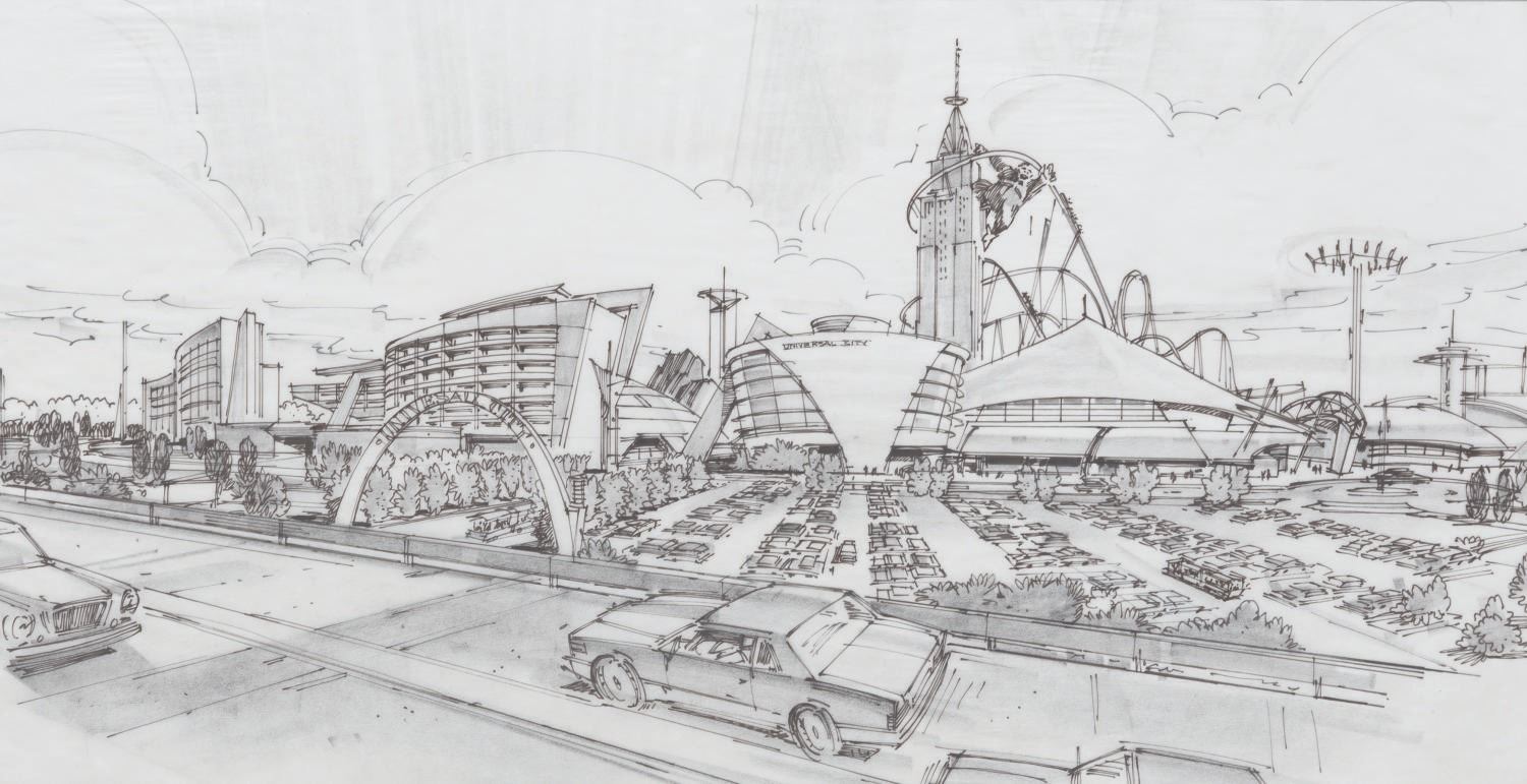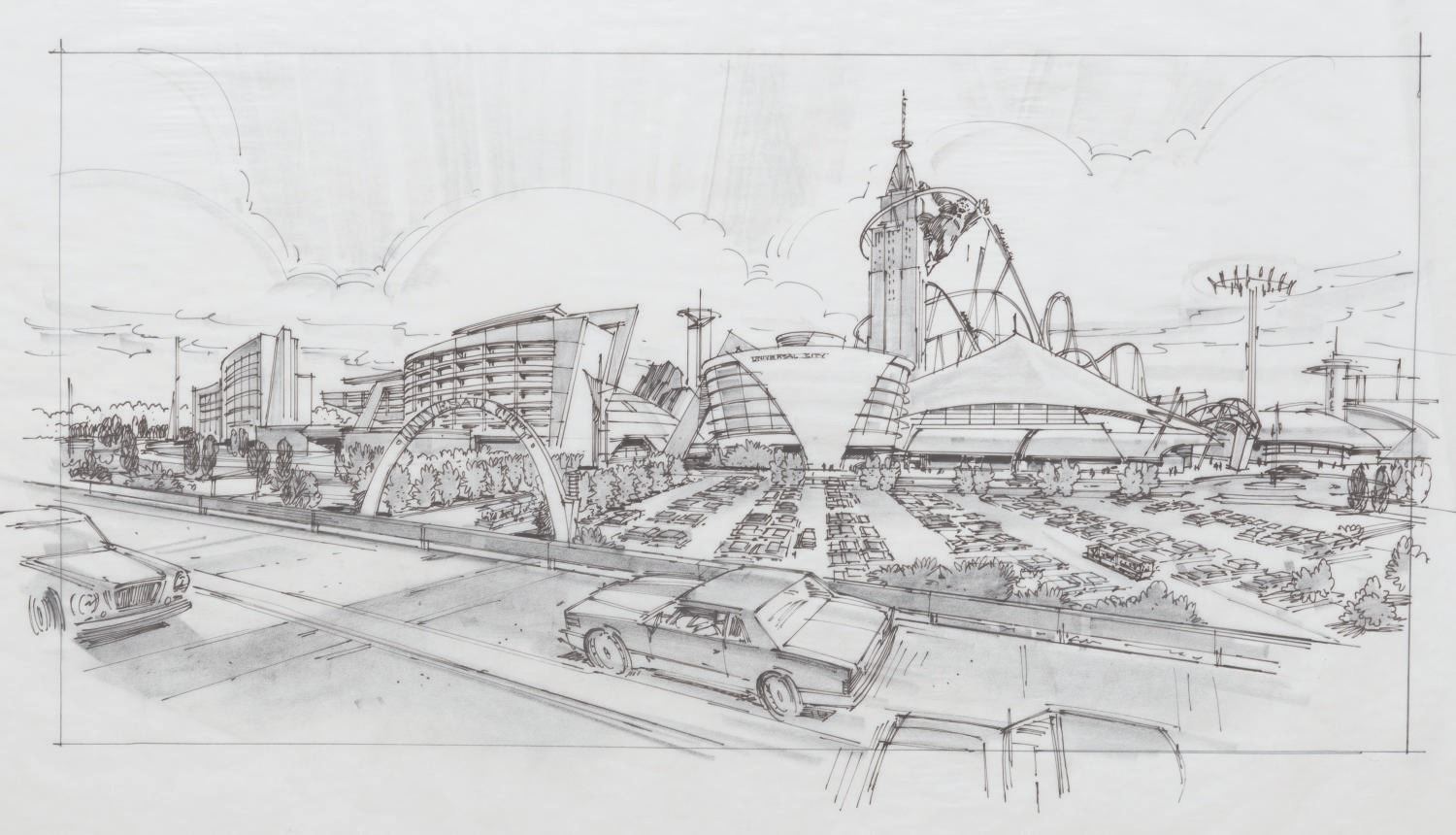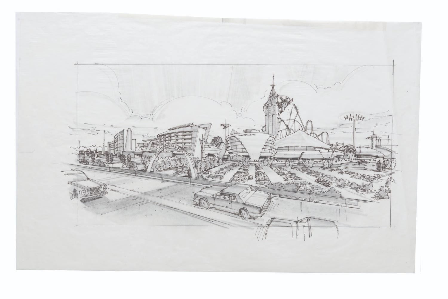 (Landmark Entertainment, 1990s) An original concept drawing for the never-realized Universal Hollywoodland theme park in Germany. Titled "Universal City" at this point in development, the art depicts the view of the theme park from the road, including the proposed King Kong tower attraction. With an image size of 10.5" x 20" on 15.75" x 24.25" vellum adhered to paper for presentation, the graphite and ink art displays in very good condition with creases, smudges, stray pencil marks, and edge wear.