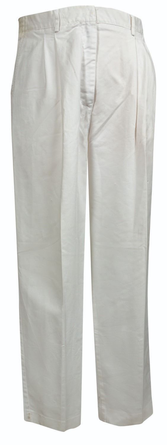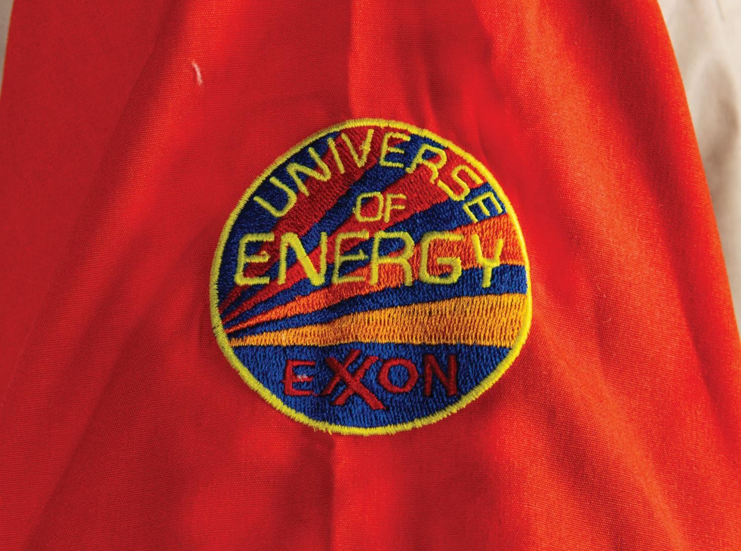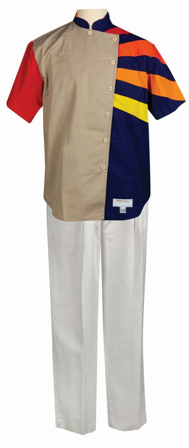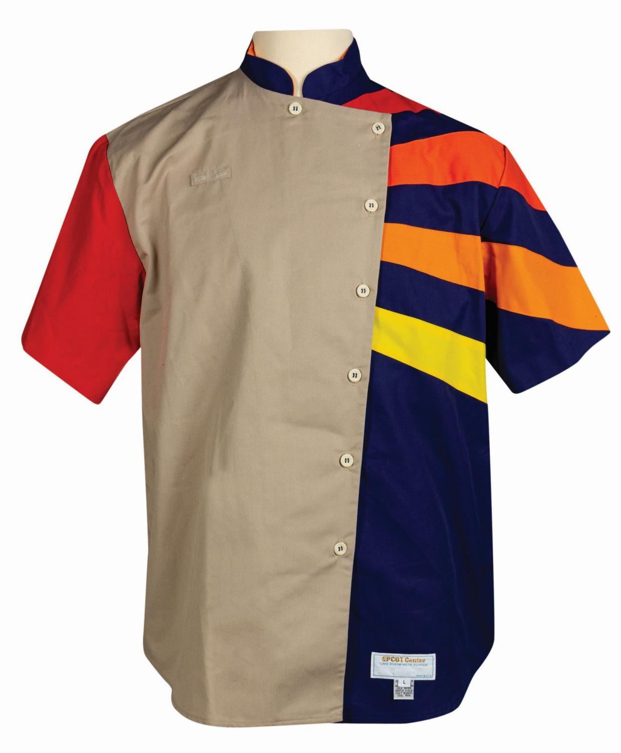 (Epcot, c. 1990s) A female cast member costume ensemble consisting of a shirt and pants from the Universe of Energy pavilion in Epcot's Future World. The uniquely designed gray, navy blue, and orange shirt features an asymmetrical front button closure, orange to yellow fabric striping at left, and an embroidered logo patch on the right sleeve. An Epcot center label and "L" size tag are sewn on at bottom left. The white pleated slacks retain an internal "F/18 " size tag and a Walt Disney Company label. The costume ensemble is in very good condition. The metal hoop from the hoop and tab closure on the pants' interior waist band has come loose and the tab itself has left a small rust stain.