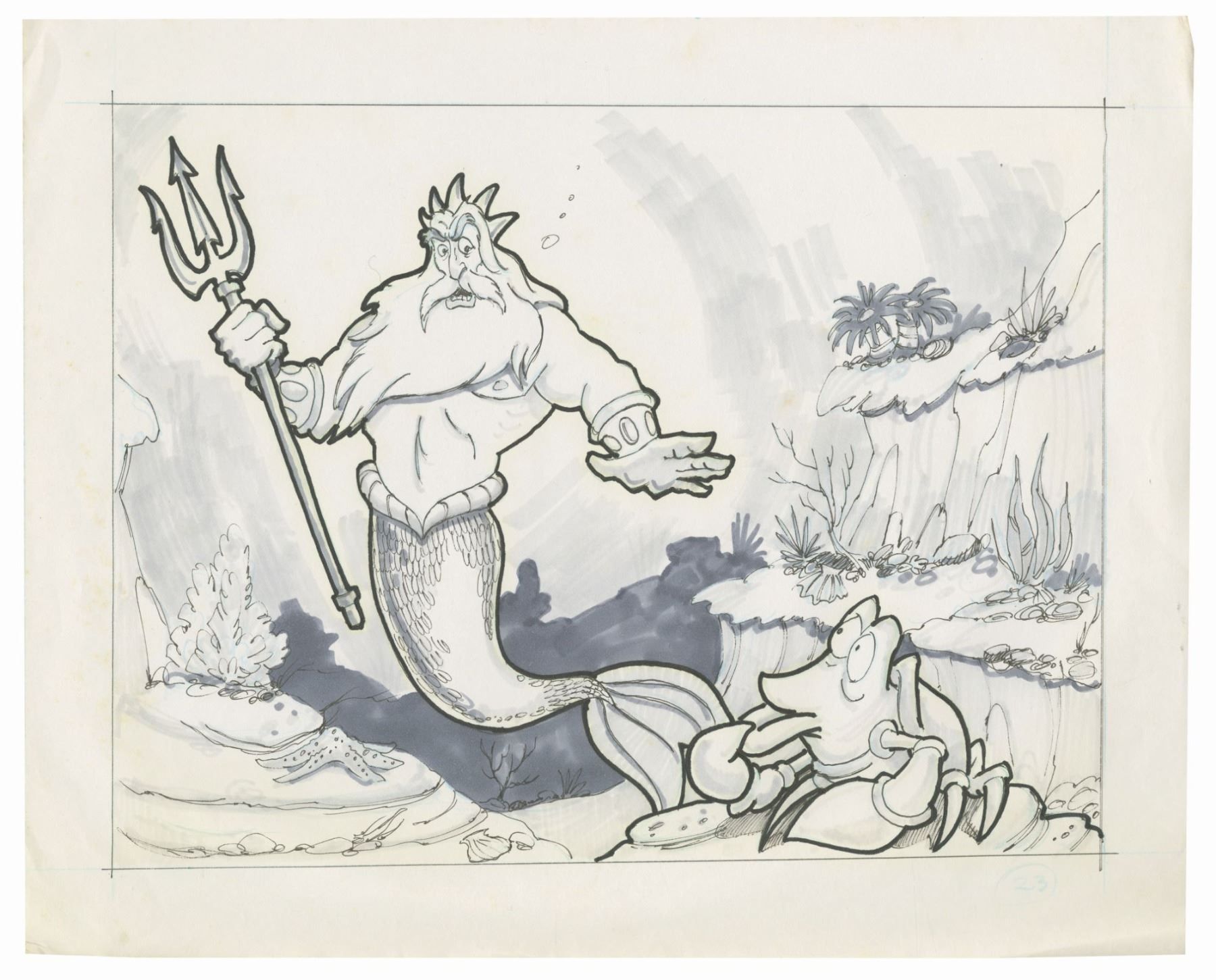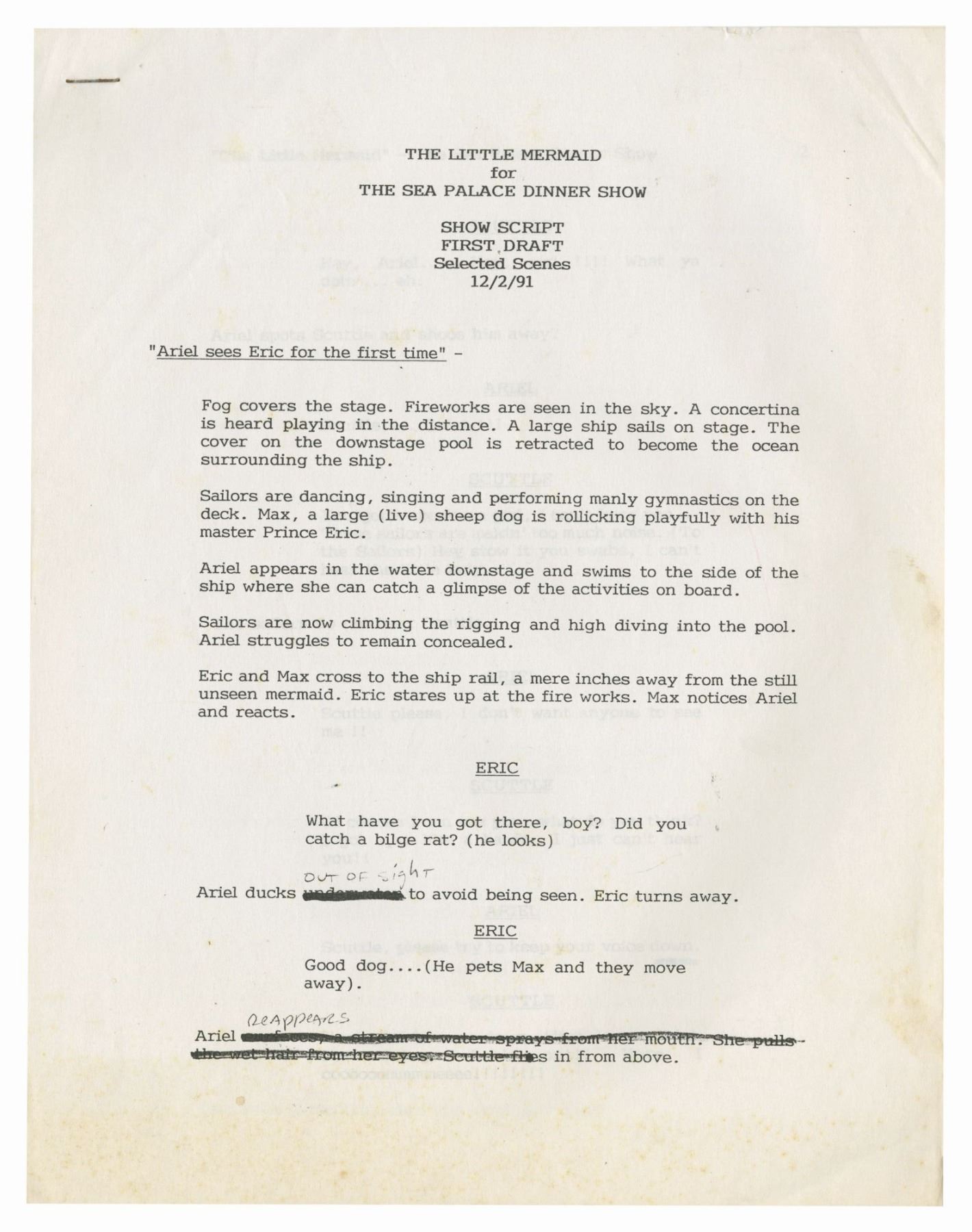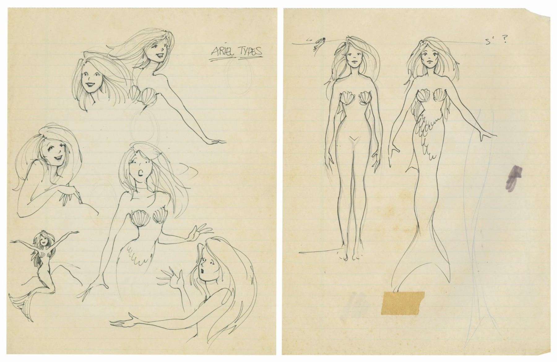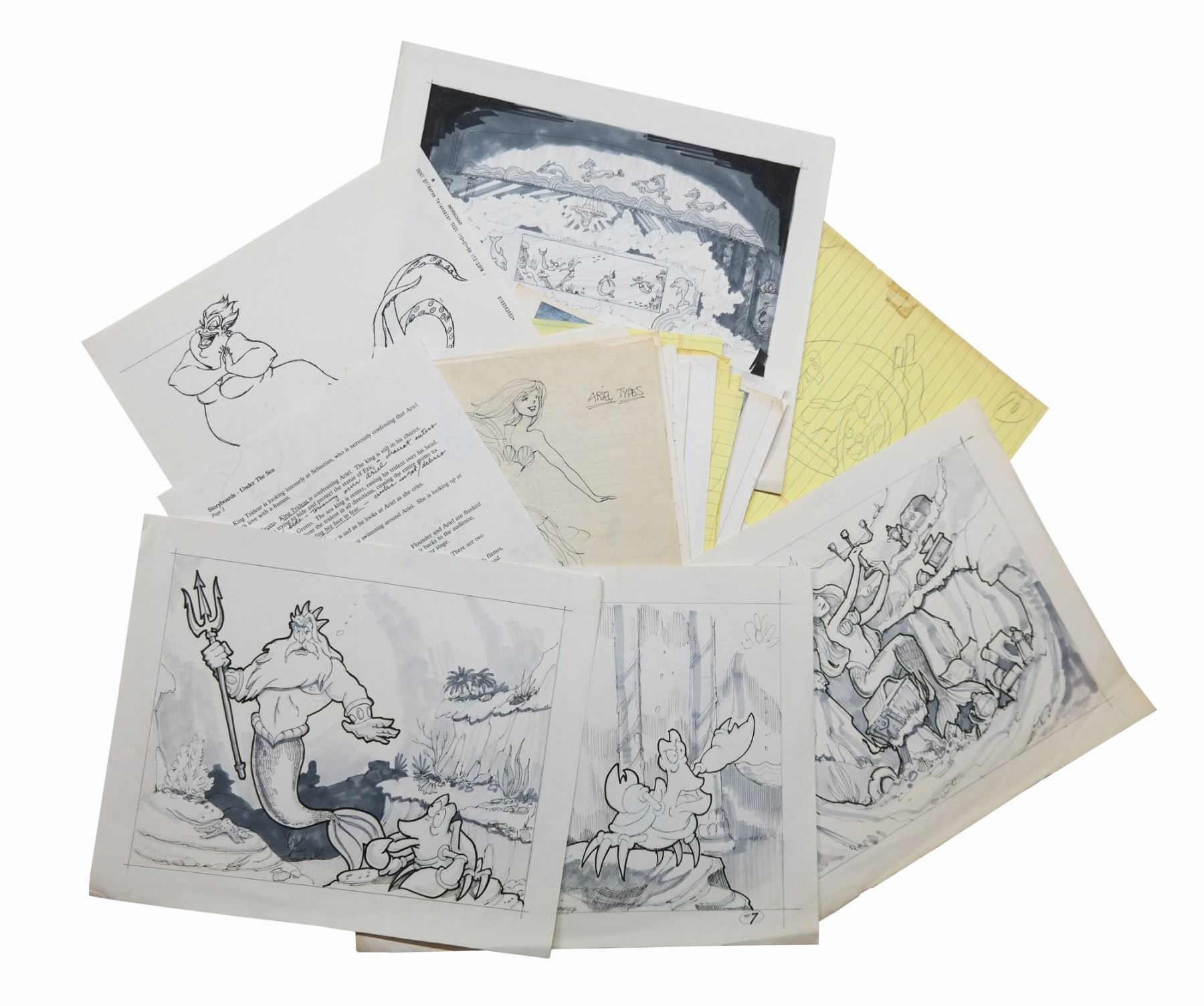 (Disney-MGM, 1991) An incredible archive of production materials from an unproduced The Little Mermaid dinner show for Disney-MGM Studios. This collection includes a 7-page first draft script of select scenes, 8-pages of typed storyboard suggestions with hand-written notes throughout, (4) original ink drawings for the show, (4) printed concept rendering, (21) sheets of original rough pencil storyboard drawings, 15-pages of printed character models and stage designs, and 2-pages of original ink Ariel drawings. This set provides an incredible look at this unproduced show and is a great artifact in the history of Disney-MGM Studios. Most of the sheets measure 11"x8.5", and the set is in very good condition overall with minor spots of wear throughout from use.