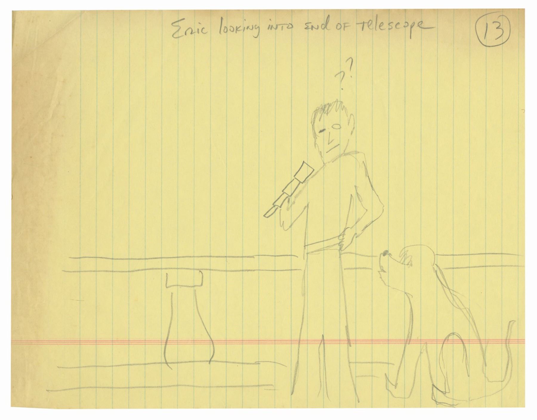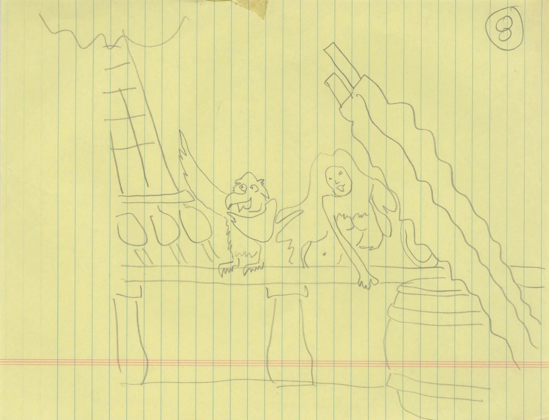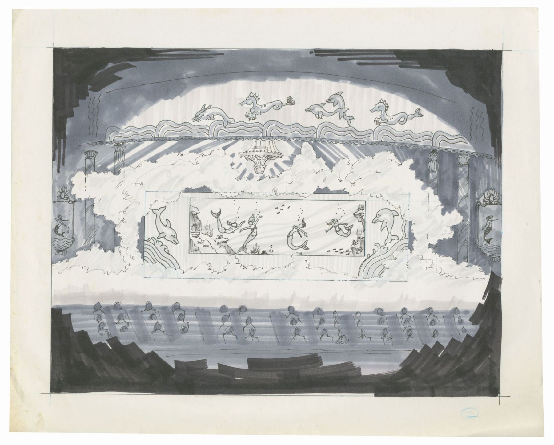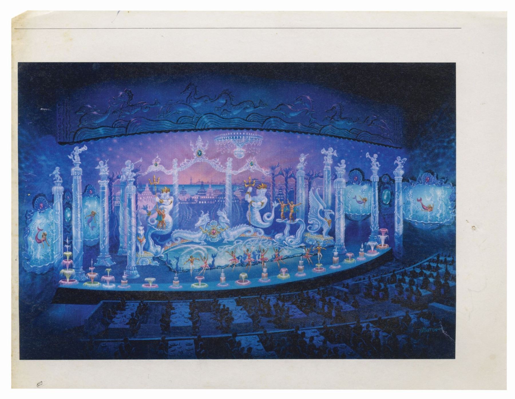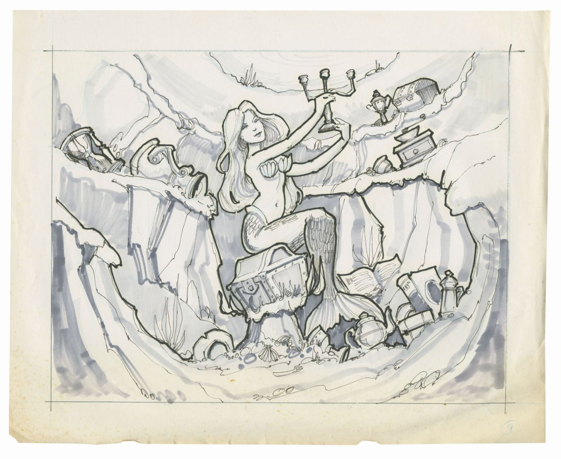 (Disney-MGM, 1991) An incredible archive of production materials from an unproduced The Little Mermaid dinner show for Disney-MGM Studios. This collection includes a 7-page first draft script of select scenes, 8-pages of typed storyboard suggestions with hand-written notes throughout, (4) original ink drawings for the show, (4) printed concept rendering, (21) sheets of original rough pencil storyboard drawings, 15-pages of printed character models and stage designs, and 2-pages of original ink Ariel drawings. This set provides an incredible look at this unproduced show and is a great artifact in the history of Disney-MGM Studios. Most of the sheets measure 11"x8.5", and the set is in very good condition overall with minor spots of wear throughout from use.