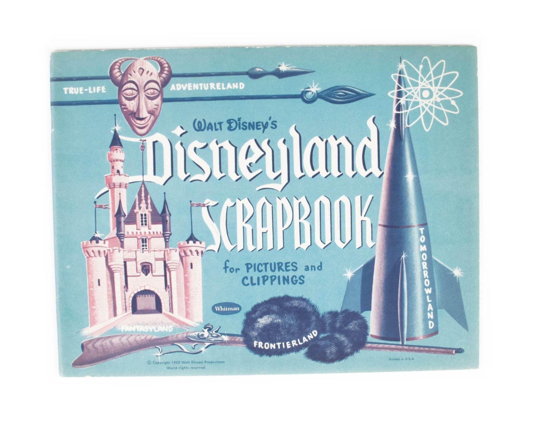 (Disneyland, 1955) A very scarce unused Disneyland scrapbook. The cover features imagery representing the park's lands, and calls Adventureland "True-Life Adventureland", based on Walt Disney's live action documentary series. Measuring 8.5"x11", the scrapbook is in very good condition with minor edge-wear.