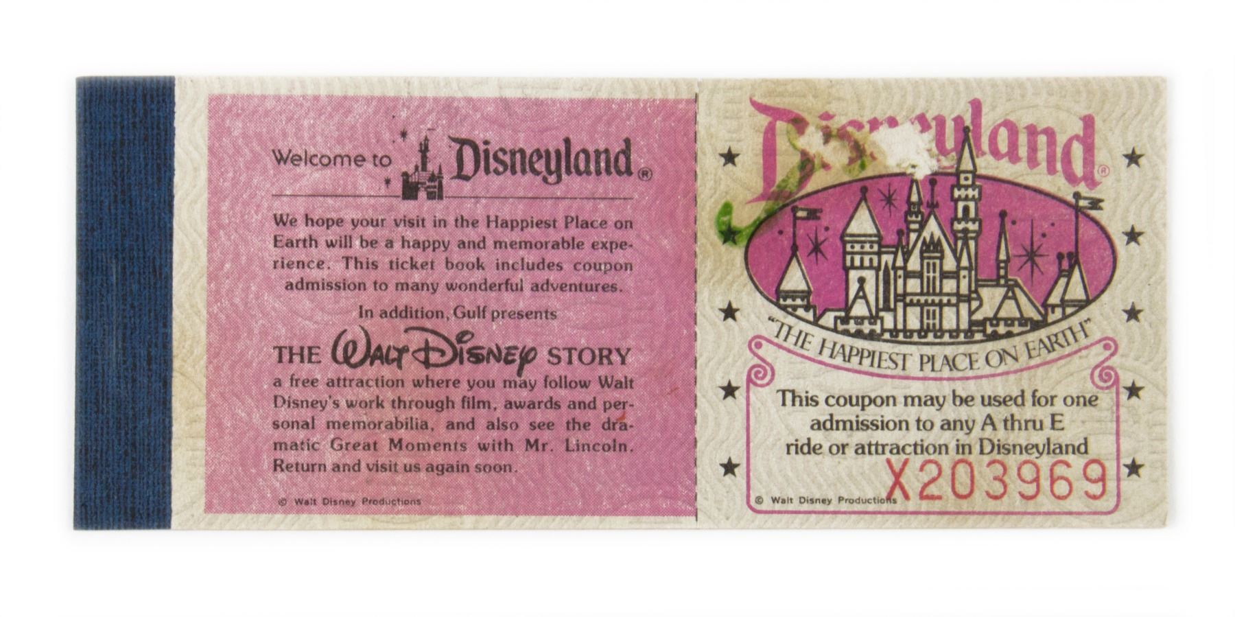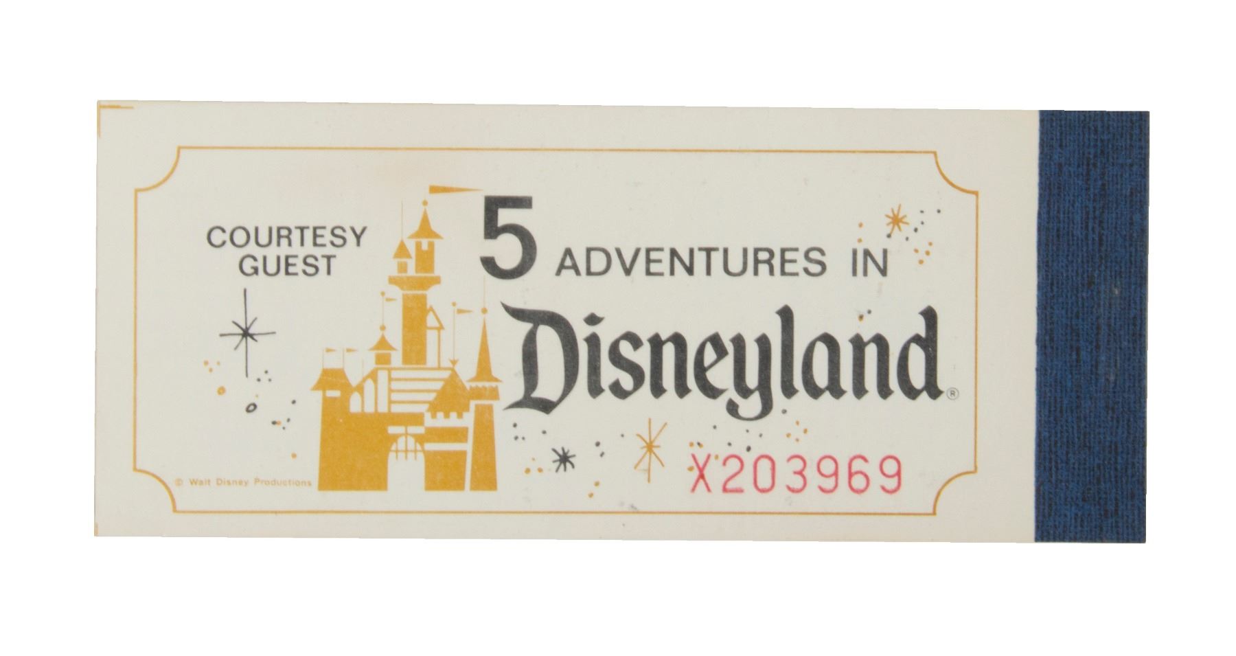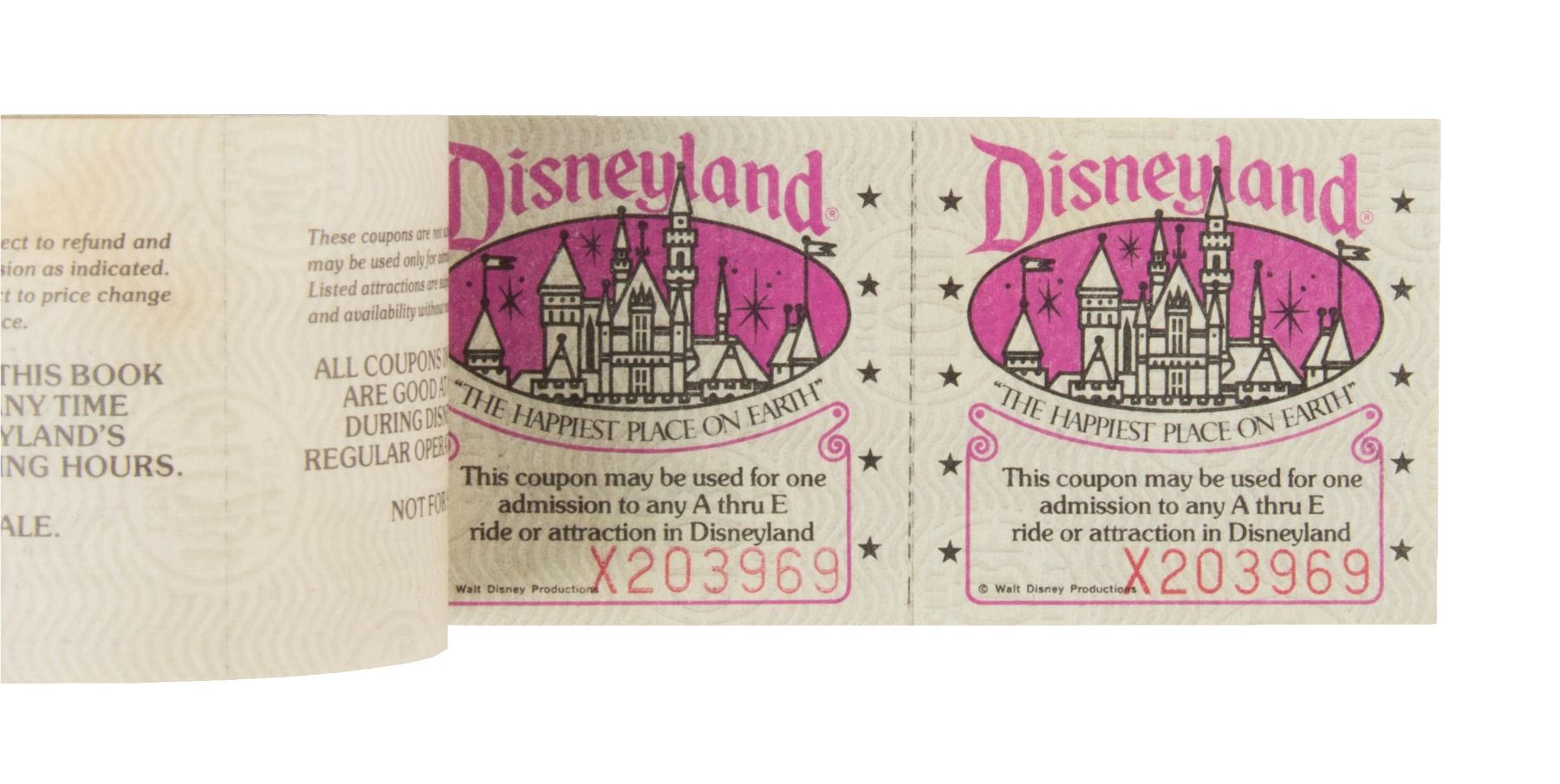 (Disneyland, 1978) A special unused "Courtesy Guest" ticket book from Disneyland. This ticket book offers "5 Adventures in Disneyland" with 5 unused ride coupons attached that were good for "any A thru E ride or attraction at Disneyland". The inner back cover lists the attractions available in each land. "Space Mountain" was such a new attraction, that the description still reads "Space Mountain - Roller Coaster Type of Attraction". Measuring 2"x5", the ticket book is in good condition with some discoloration and wear on the word "Disneyland" on the front cover.