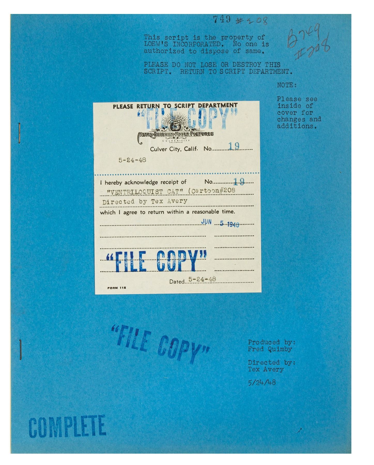 (MGM, 1948) An original file copy script for the short "Ventriloquist Cat." The short featured a beleaguered cat who comes across a device for throwing his voice, which he then uses to torment the dog chasing him, and is directed by Tex Avery. The script is marked with "File Copy" multiple times, and is dated 5-24-48 although the short was not released until 1950. Measuring 11"x8.5", the script is in very good condition with some edge-wear from age and use, as well as a few spots of discoloration on the front and reverse.
