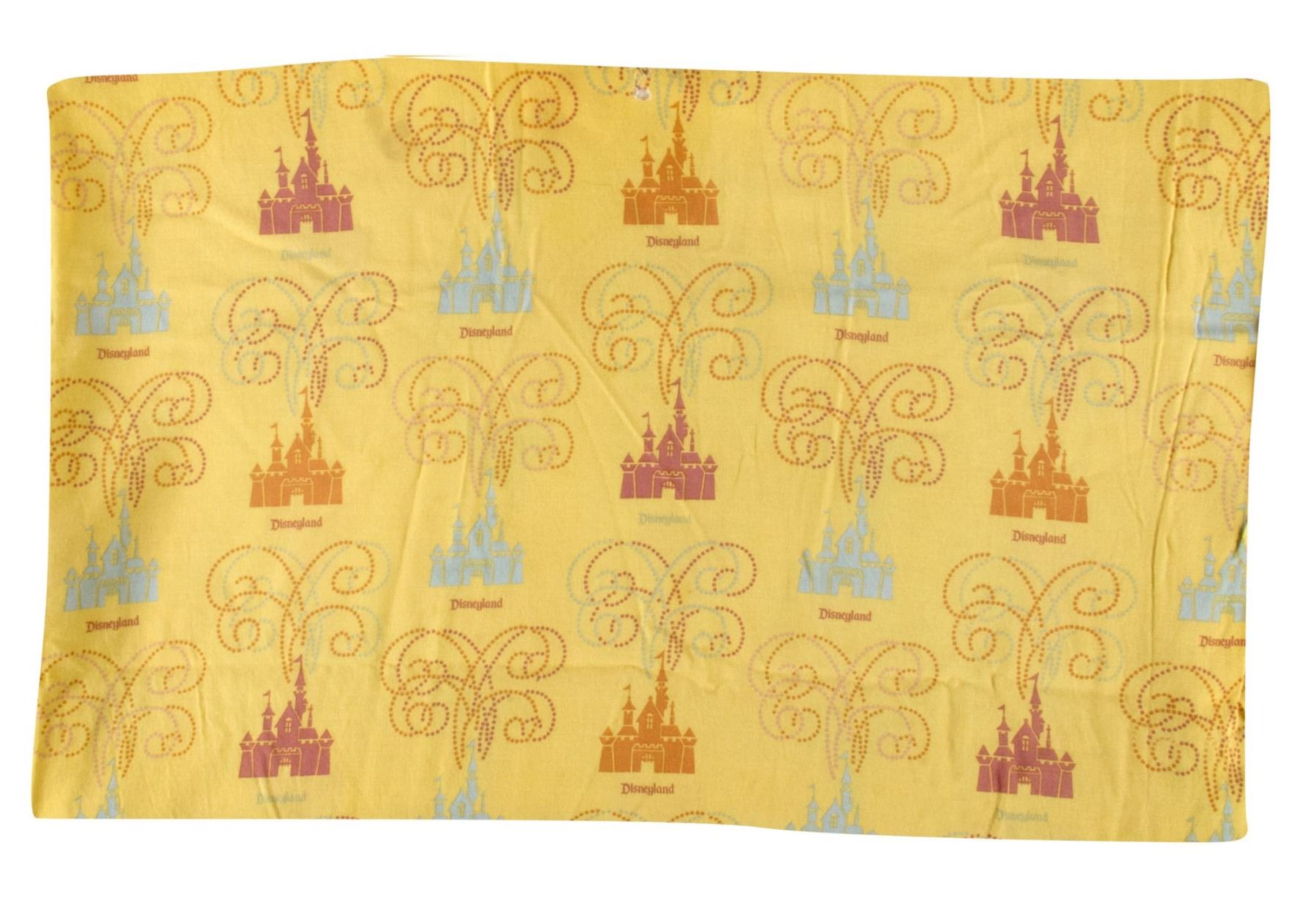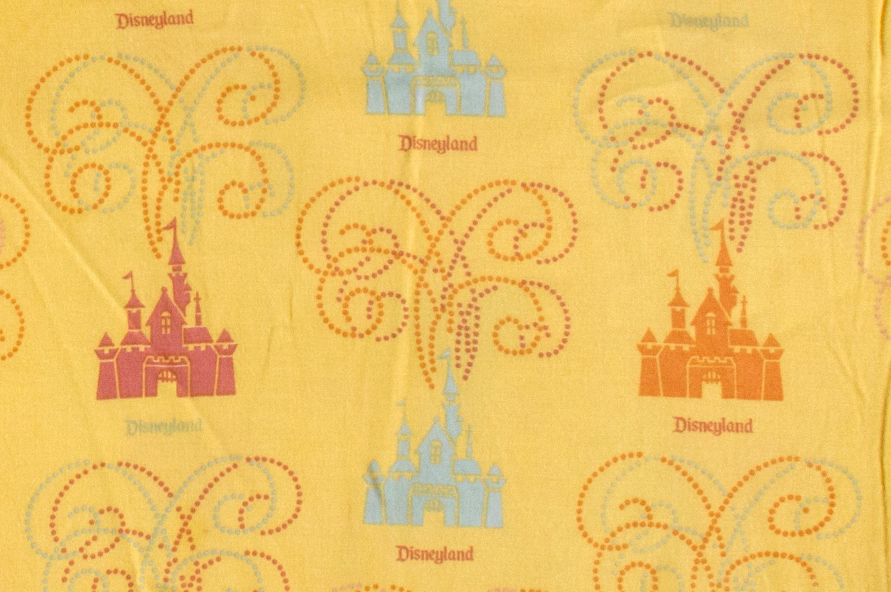 (Disneyland, c.2010) A large section of reproduced fabric featuring a Sleeping Beauty Castle logo. The pattern depicts was used in the 1960s and 1970s on souvenir wrapping paper and shopping bags from the park. This vintage-inspired fabric measures approximately 100"x60", and the condition is good overall with some minor spots of wear throughout.