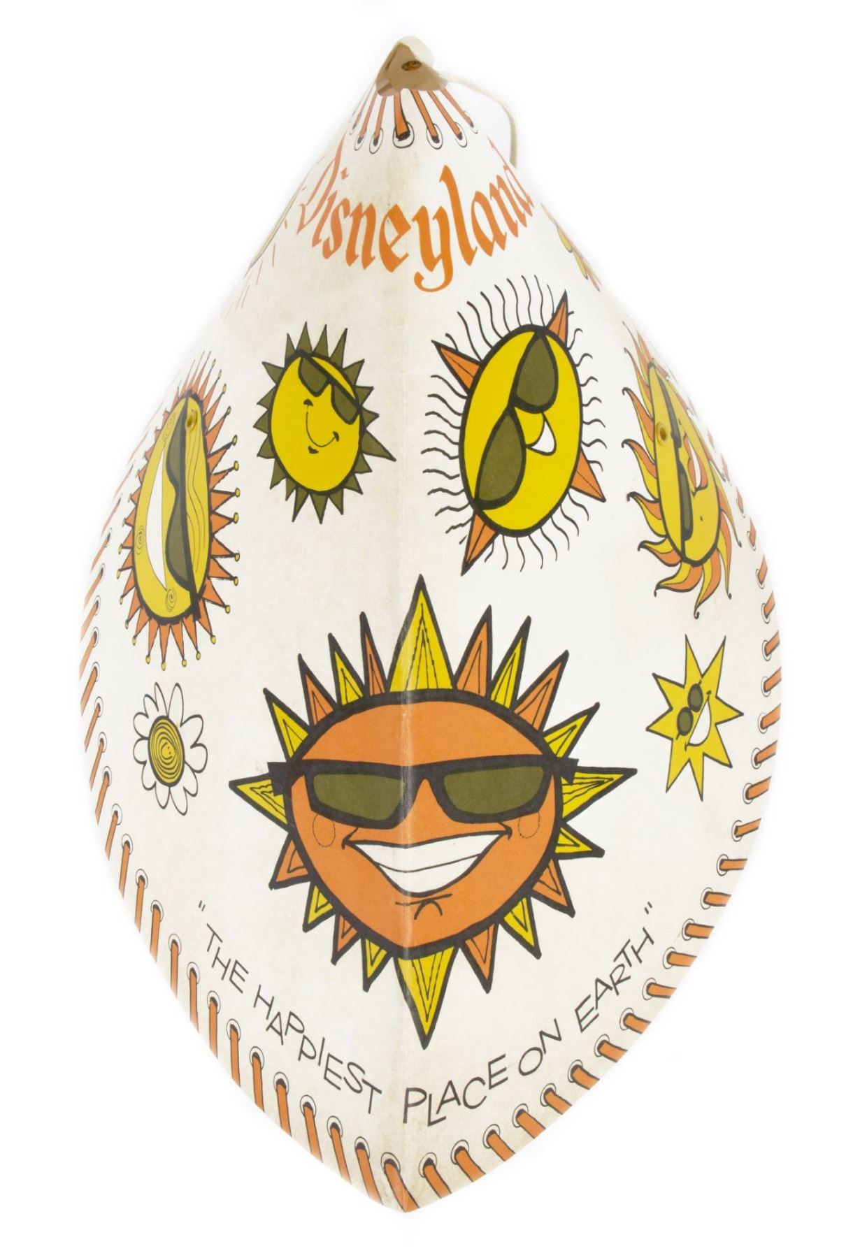 (Disneyland, c.1959) A very rare and unusual souvenir paper sunhat from Disneyland. The hat reads "Disneyland" and "The Happiest Place on Earth" on the front, and has several illustrations depicting the California sunshine. Among the souvenirs from the park's first few years, delicate paper items such as this are exceptionally rare. The hat measures approximately 12" in diameter when opened, and still includes the original shoe-lace cord. The condition is fair to good, with some yellowing to the paper from age and some creasing and wear around the edges. It is uncertain if the hat originally came with the fold down the center, or if it was caused from storage of the hat.