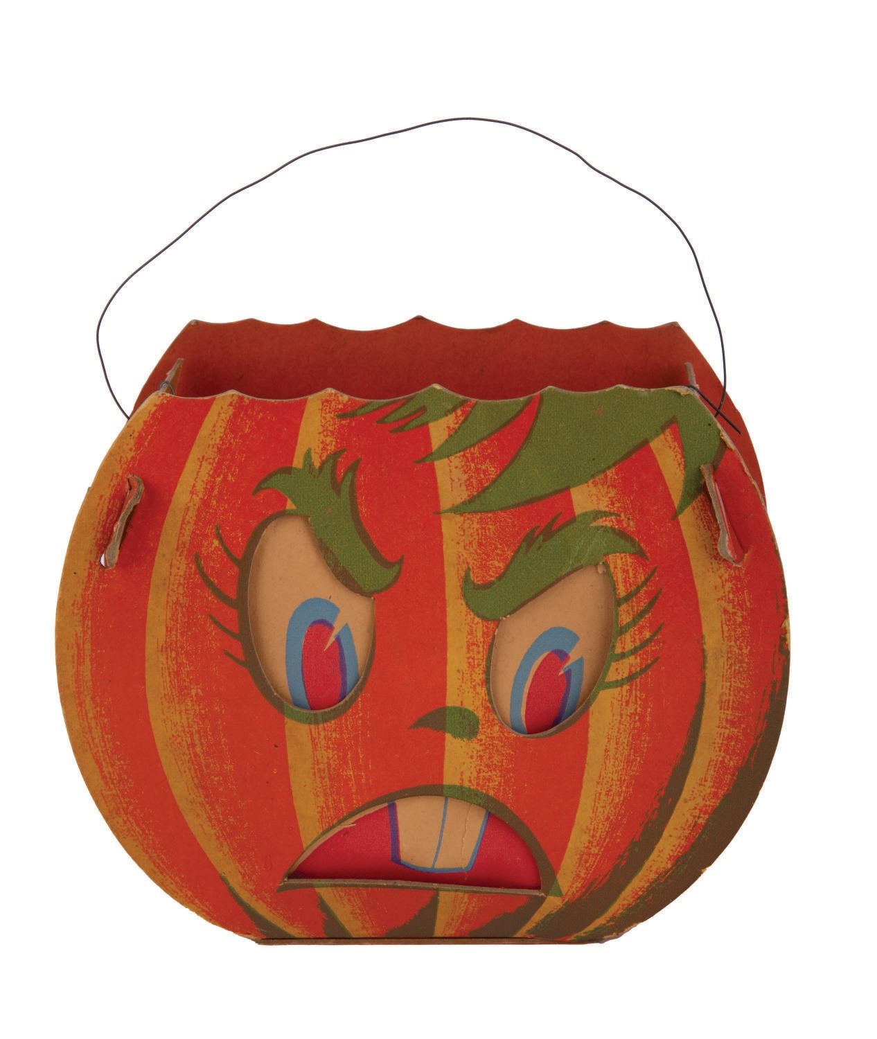 (1930s) A rare American made die-cut cardboard lantern from the 1930s. The 3"x6.25"x5.5" tall double sided lantern features paper inserts for the eyes and mouth, In fine condition with expected wear from age.