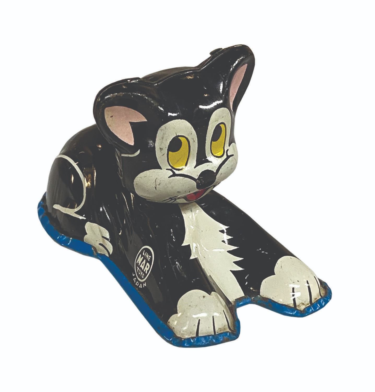 (Disney, c.1950s) A vintage Figaro rolling tin-litho friction toy manufactured by LineMar. All of the wheels roll freely, but the friction motor no longer charges. Measuring 2.75" long, the piece is in very good condition with minor surface wear, some small dents to the bottom panel, and faint oxidation at the extreme edges.