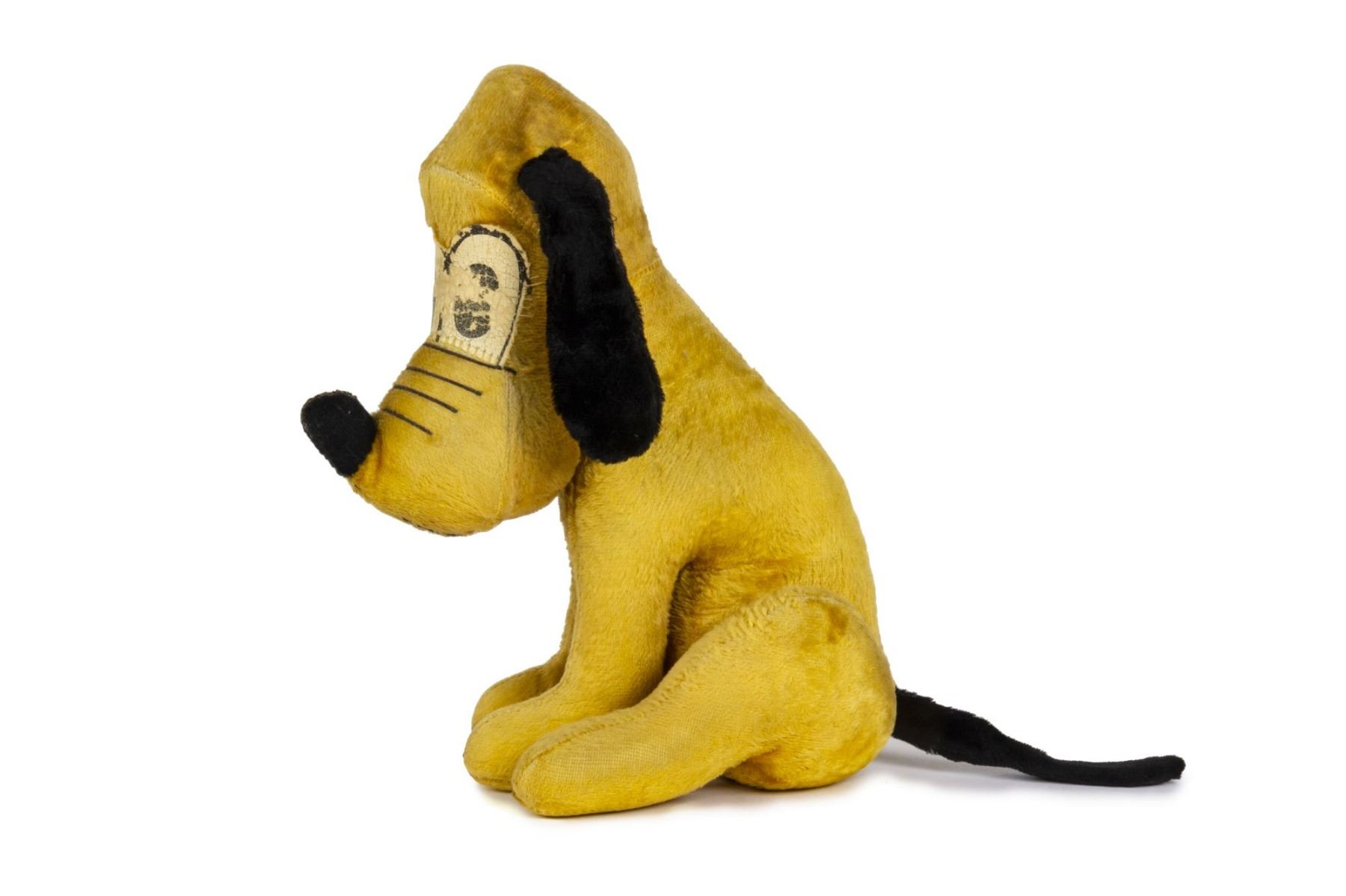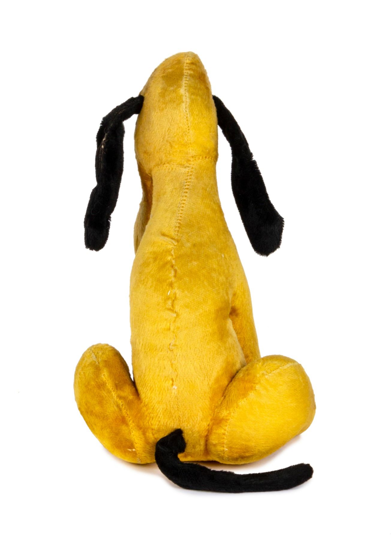 (Gund, 1940s) A vintage Pluto doll created by Gund Manufacturing Company in the 1940s. This cloth doll has pipe cleaner inserts within the ears, which allows them to bend, and the doll retains the original tail that is frequently missing. Measuring approximately 12" tall, the doll is in fair condition overall with some worn areas from use, particularly to the eyes and base.