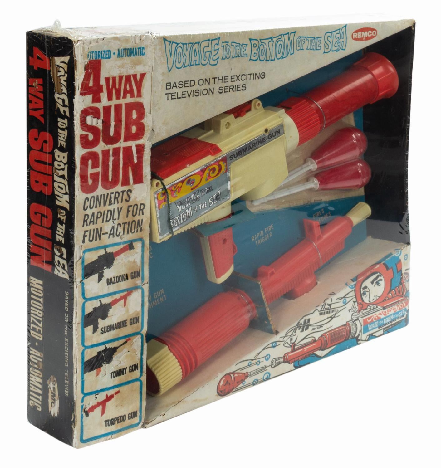 (Remco, 1966) An extremely rare Voyage to the Bottom of the Sea 4 Way Sub Gun manufactured by Remco. The 4 Way Sub Gun was only available for a short time in a small test market before Remco decided to halt production and cancel nation wide distribution. As such, very few of these toys were ever made, and far fewer survive. The "4 Way" gun is so called because it can transform from a submarine gun to a bazooka gun, tommy gun, or torpedo gun through addition, subtraction, or reconfiguration of the various accessories. All items are housed in the original cardboard packaging. Measuring 16"x18.25" and 3" deep, it appears to be in fair condition. The weapon and accessories present in good or very good condition. The electronics are untested. At one time, this rare toy and the packaging were exposed to water, causing staining and wear to the box and spotting to the tip of the gun. Some areas of the box have received extensive amateur restoration.