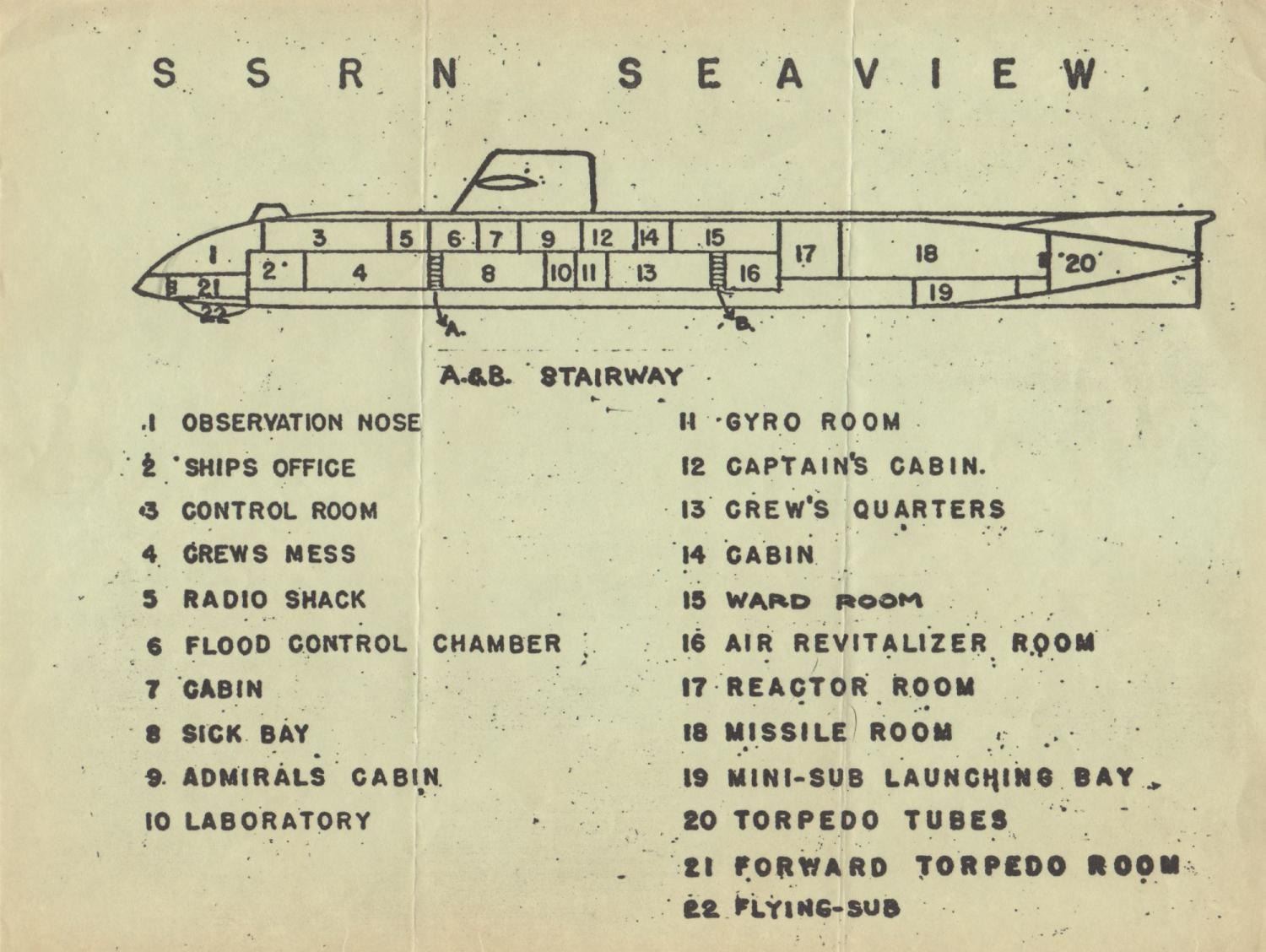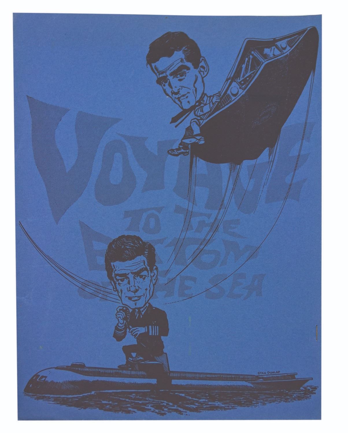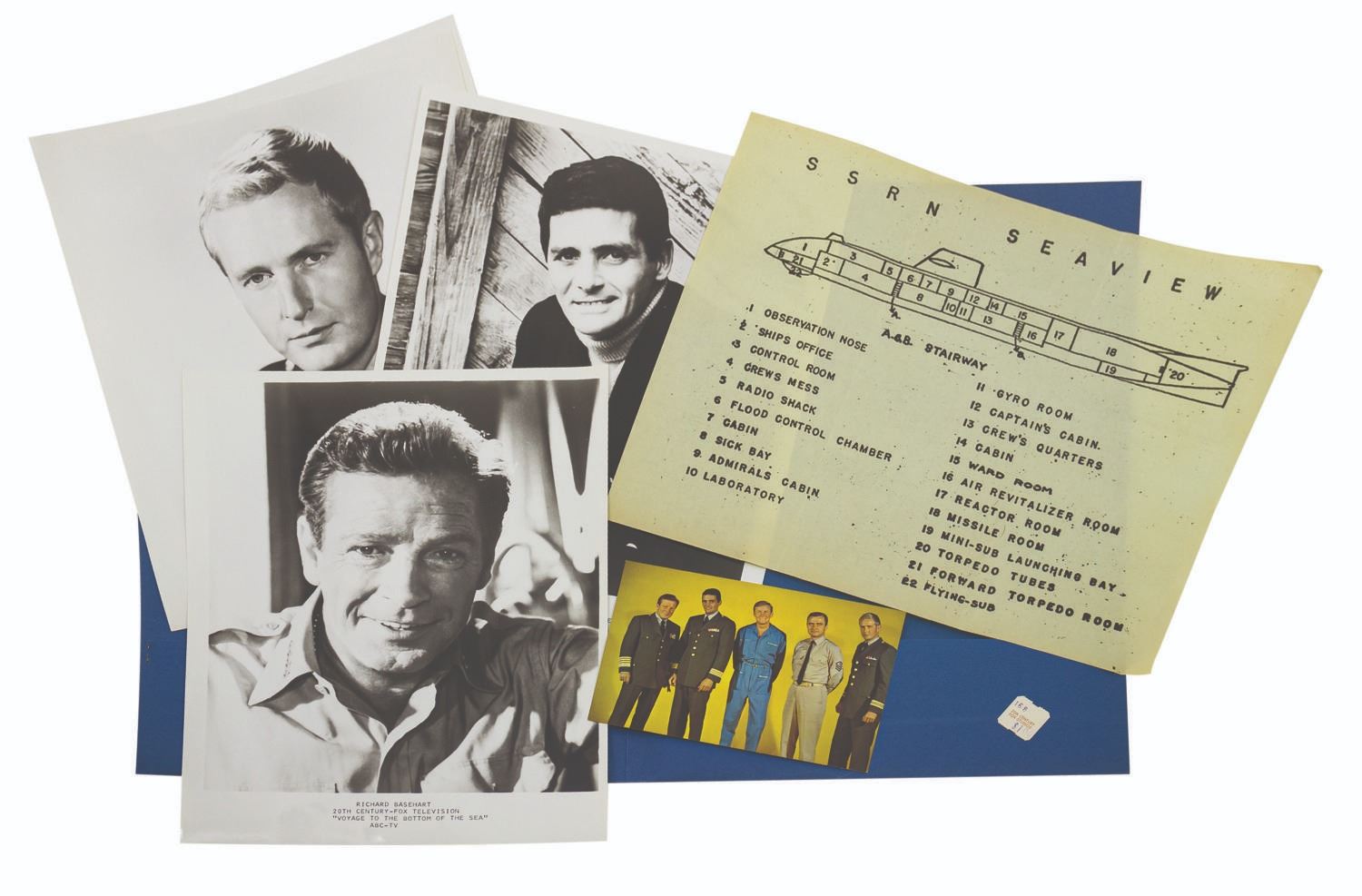 (TCF TV, 1964-68) A vintage promotional packet for the Irwin Allen TV series Voyage to the Bottom of the Sea. Consisting of (4) gelatin silver 8"x10" publicity photos of the cast, a color 3.5"x5.5" cast portrait post card with printed facsimile signatures, and a mimeographed diagram of the SSRN Seaview, sets like these were available for purchase at the studio gift shop. All items are assembled in a cardstock folder with a cast caricature on the front cover, which retains a studio price tag sticker. Measuring 12.25"x9.5", the folder and its contents are in generally very good condition. The folder has some handling wear, and the diagram exhibits corner and edge creasing.