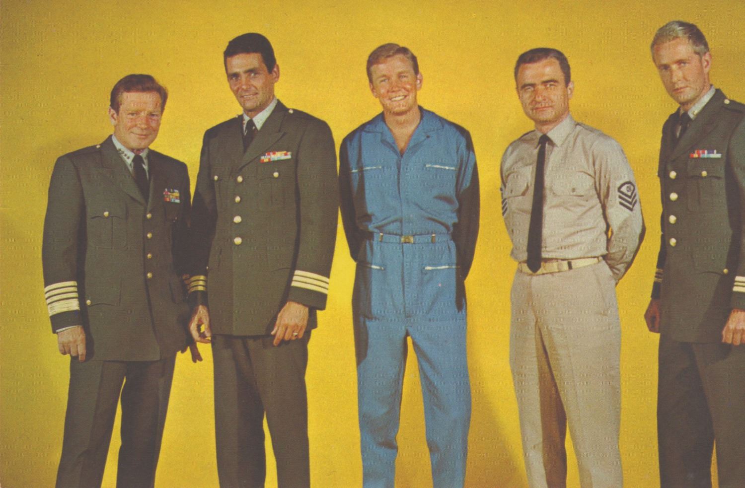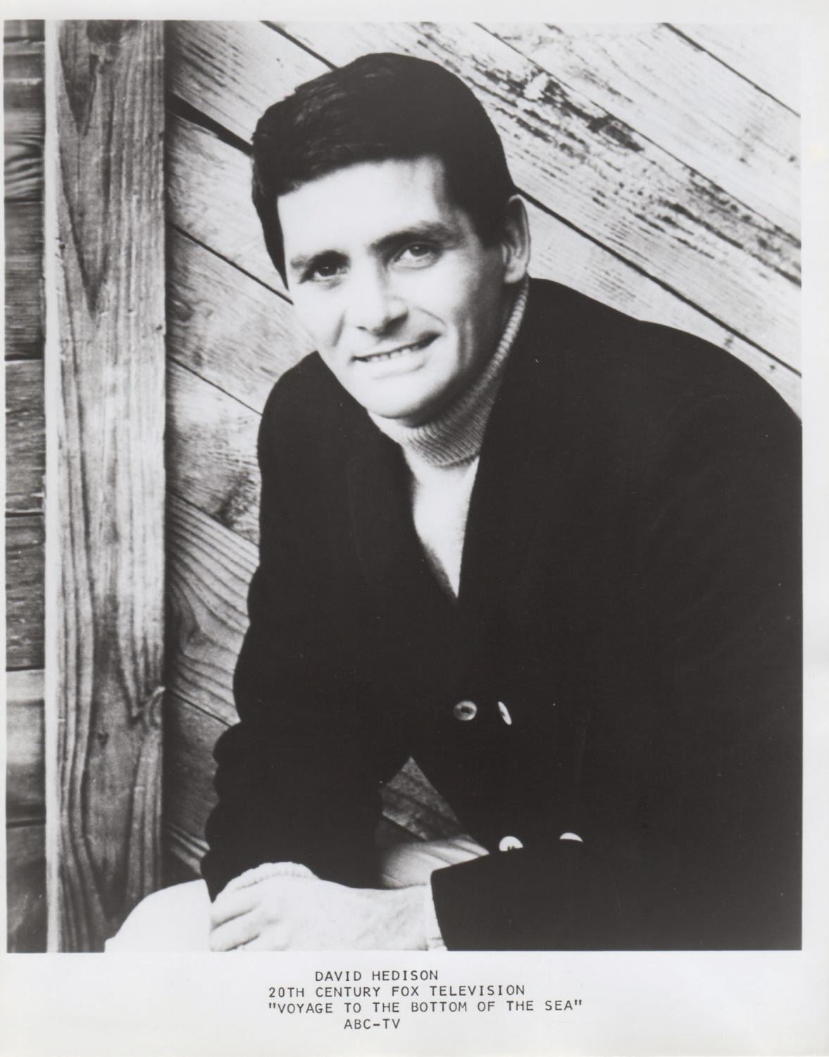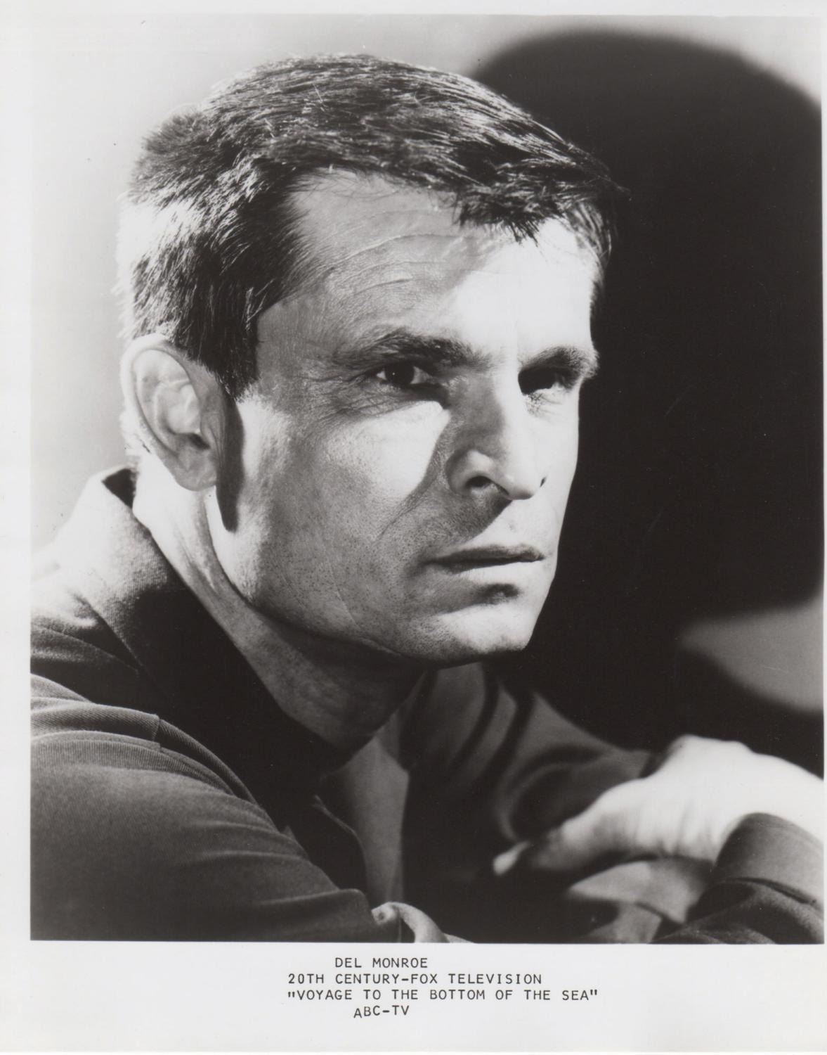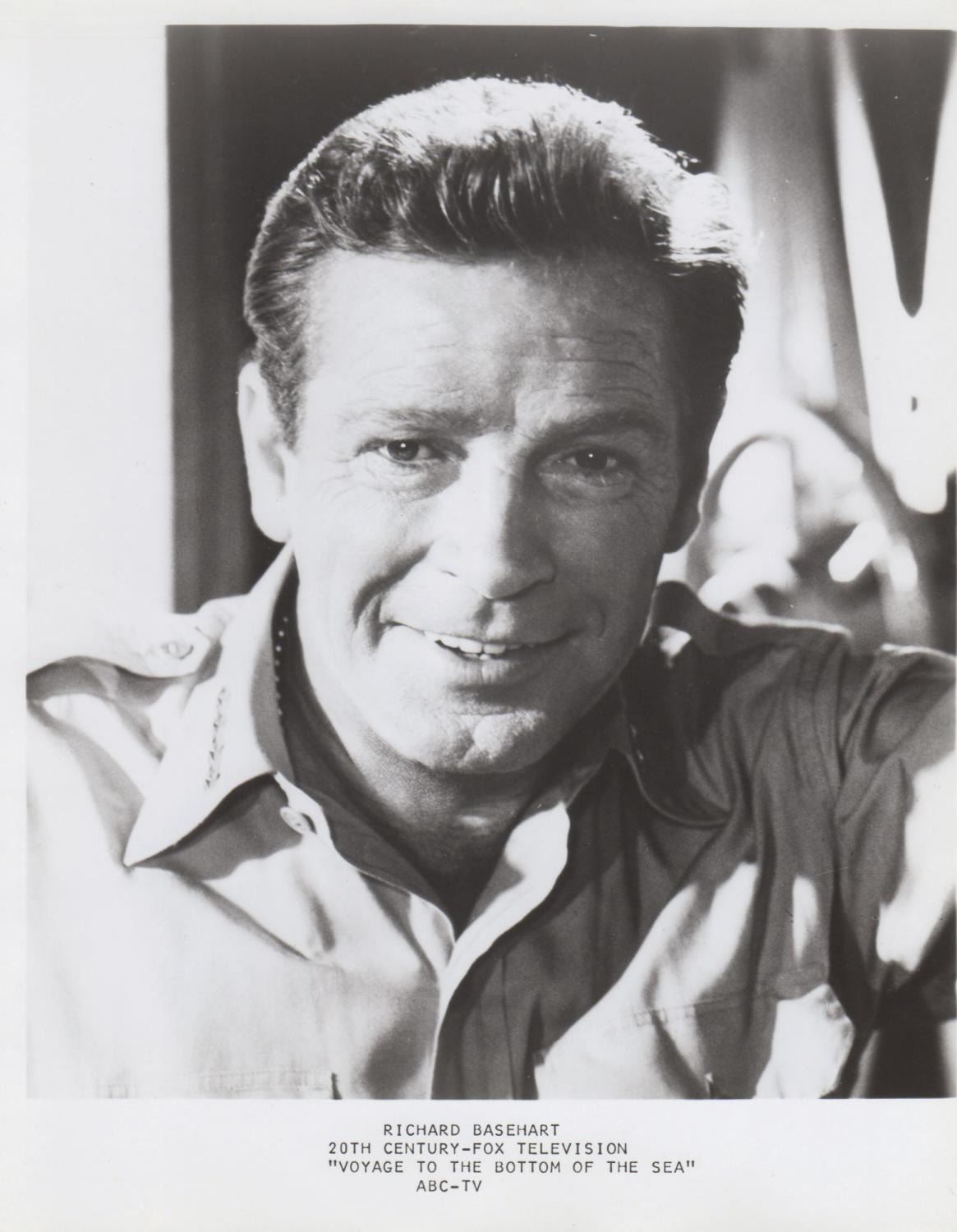 (TCF TV, 1964-68) A vintage promotional packet for the Irwin Allen TV series Voyage to the Bottom of the Sea. Consisting of (4) gelatin silver 8"x10" publicity photos of the cast, a color 3.5"x5.5" cast portrait post card with printed facsimile signatures, and a mimeographed diagram of the SSRN Seaview, sets like these were available for purchase at the studio gift shop. All items are assembled in a cardstock folder with a cast caricature on the front cover, which retains a studio price tag sticker. Measuring 12.25"x9.5", the folder and its contents are in generally very good condition. The folder has some handling wear, and the diagram exhibits corner and edge creasing.