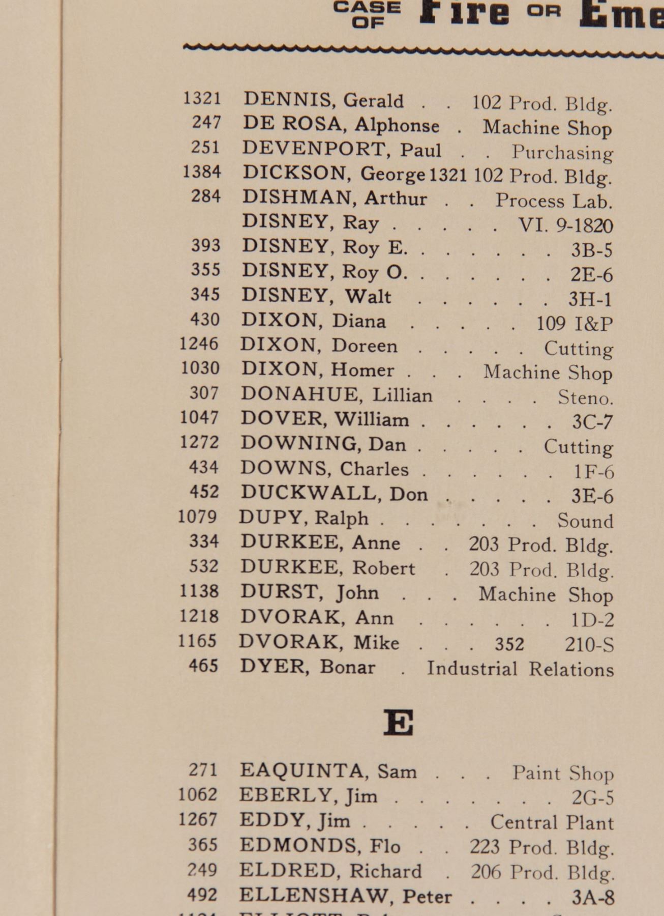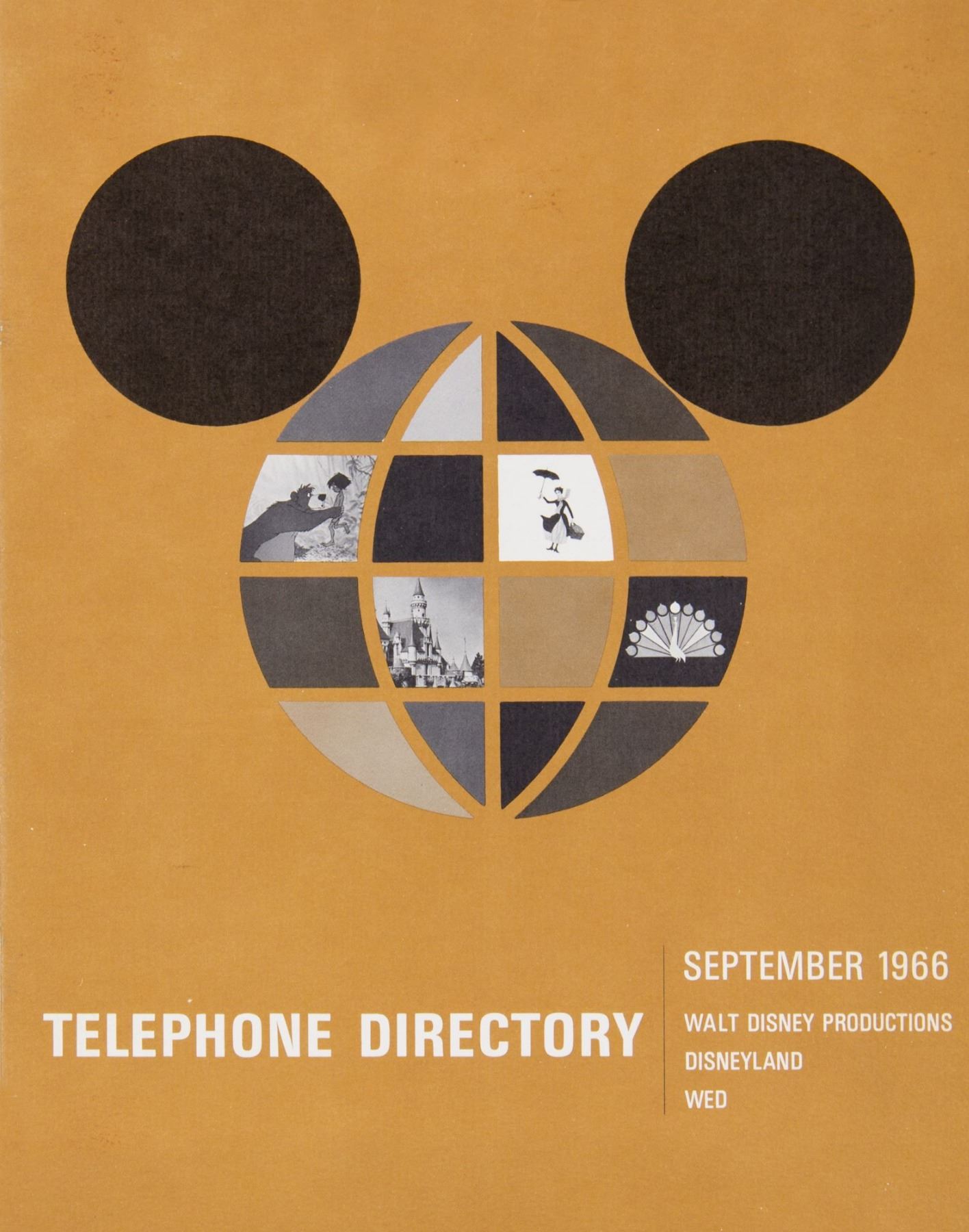 (Disneyland, 1966) A very rare telephone directory for Walt Disney Productions, Disneyland, and WED. This 26-page directory lists the employees of the company and their departments, and includes contact information for notable WED employees such as Marc Davis and Herb Ryman, as well as Walt Disney himself. This was the last directory to feature Walt Disney prior to his death at the end of that year. This directory measures 11"x8.5" and is in fine condition.