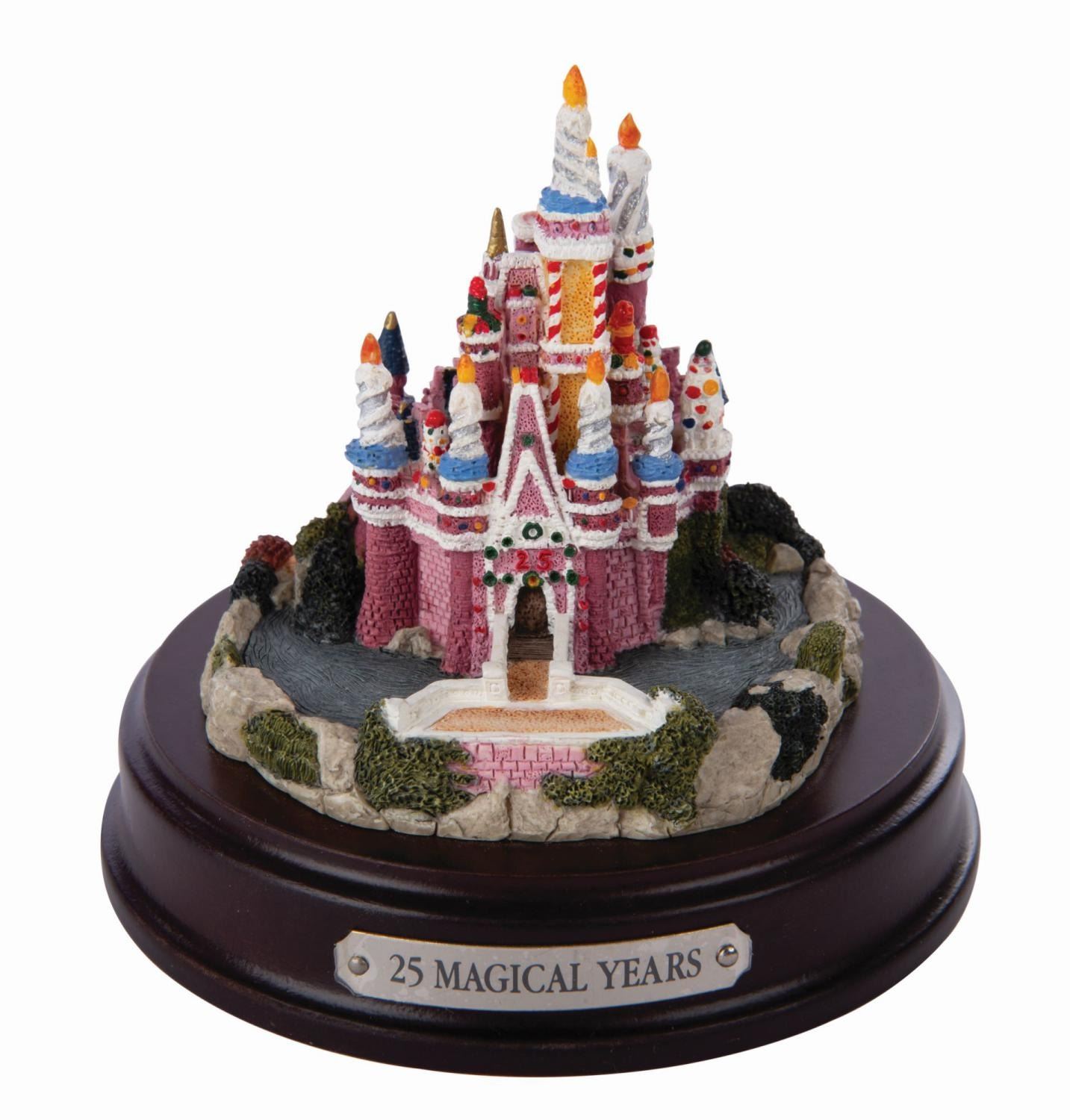 (Walt Disney World, 1997) A limited-edition Cinderella Castle birthday cake figurine by Jan M. Fraser. Created in honor of the 25th anniversary of Walt Disney World, the miniature commemorates perhaps the most ambitious castle overlay in Walt Disney World history. Measuring 4.73 in diameter and 4.5" tall, the commemorative museum miniature is in fine condition, retaining the plaque's protective film, and official The Art of Disney sticker under base.